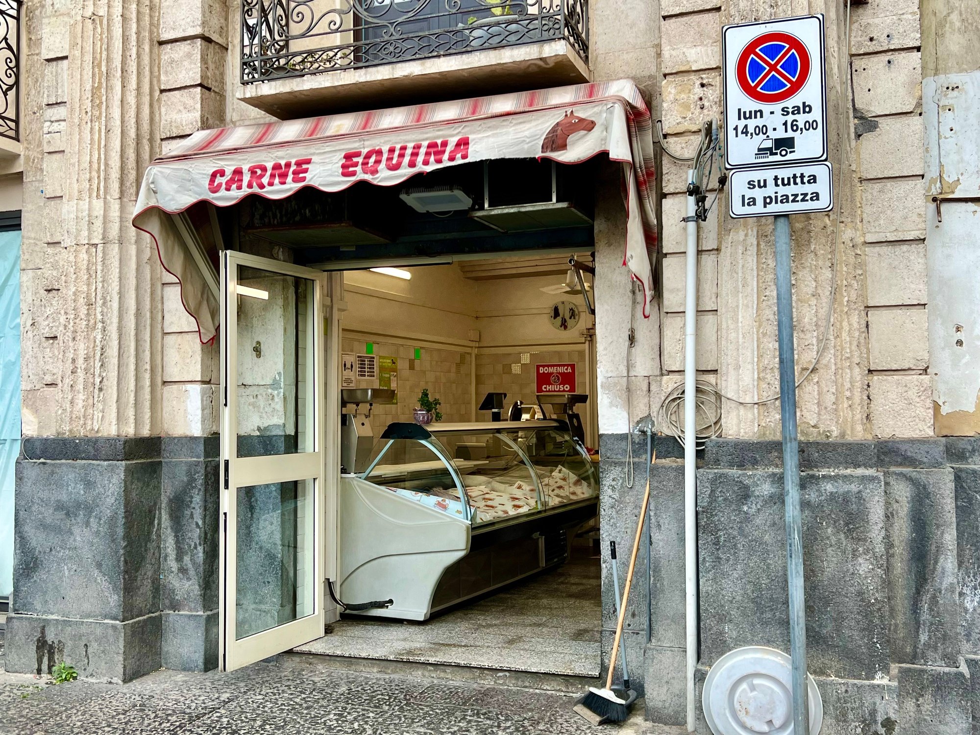 The busy main square and several remarkable churches were the main sights here, and they were open. In the evening, there were plenty of nice restaurants to choose from as well. The municipal building looked like an old Palazzo that it once was. First day, first pizza. But no sausage for us. We had already started seeing cavallo (horse) butcher shops, popular in Catania and nearby areas, and weren’t ready for equine sausage.