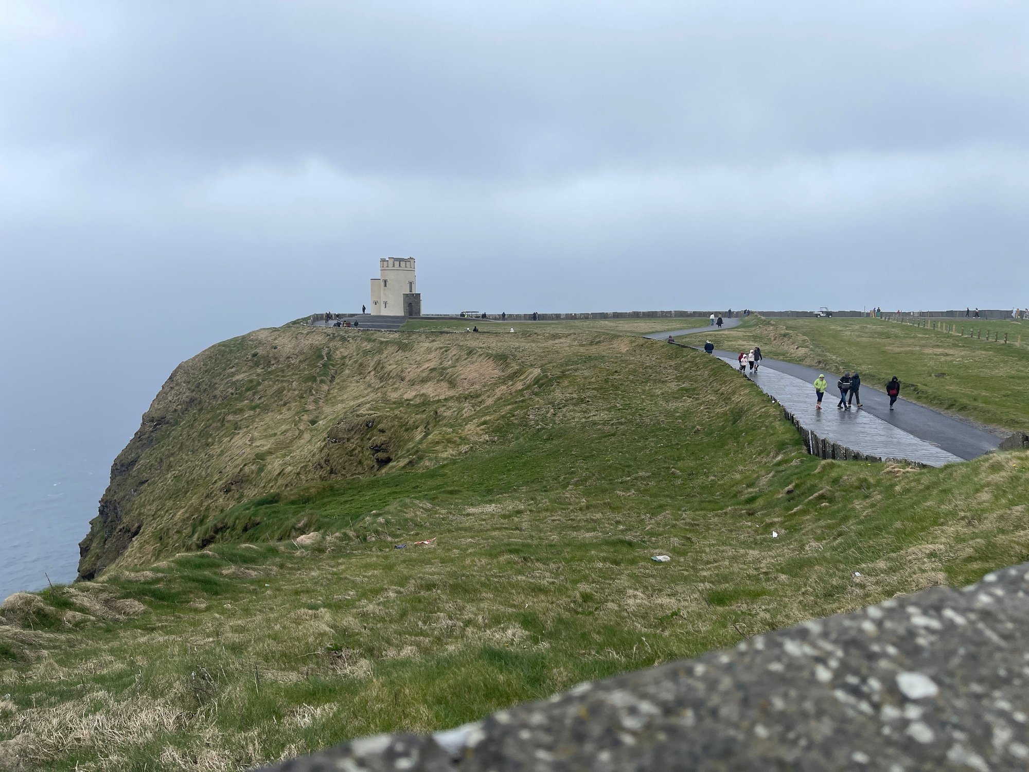 After the visit of Inisheer, we then cruised alongside the foot of the Cliffs of Moher. This is a unique view of the Cliffs of Moher from the water. We then had a traditional Irish pub meal suggested by the tour guide. After the meal, we spent an hour at the top of the Cliffs. We took a walk onward to the tower near the visitor center. Unfortunately, a stroll along the cliff edge was accompanied with a sudden heavy rainfall, and we quickly took shelter at the visitor center.