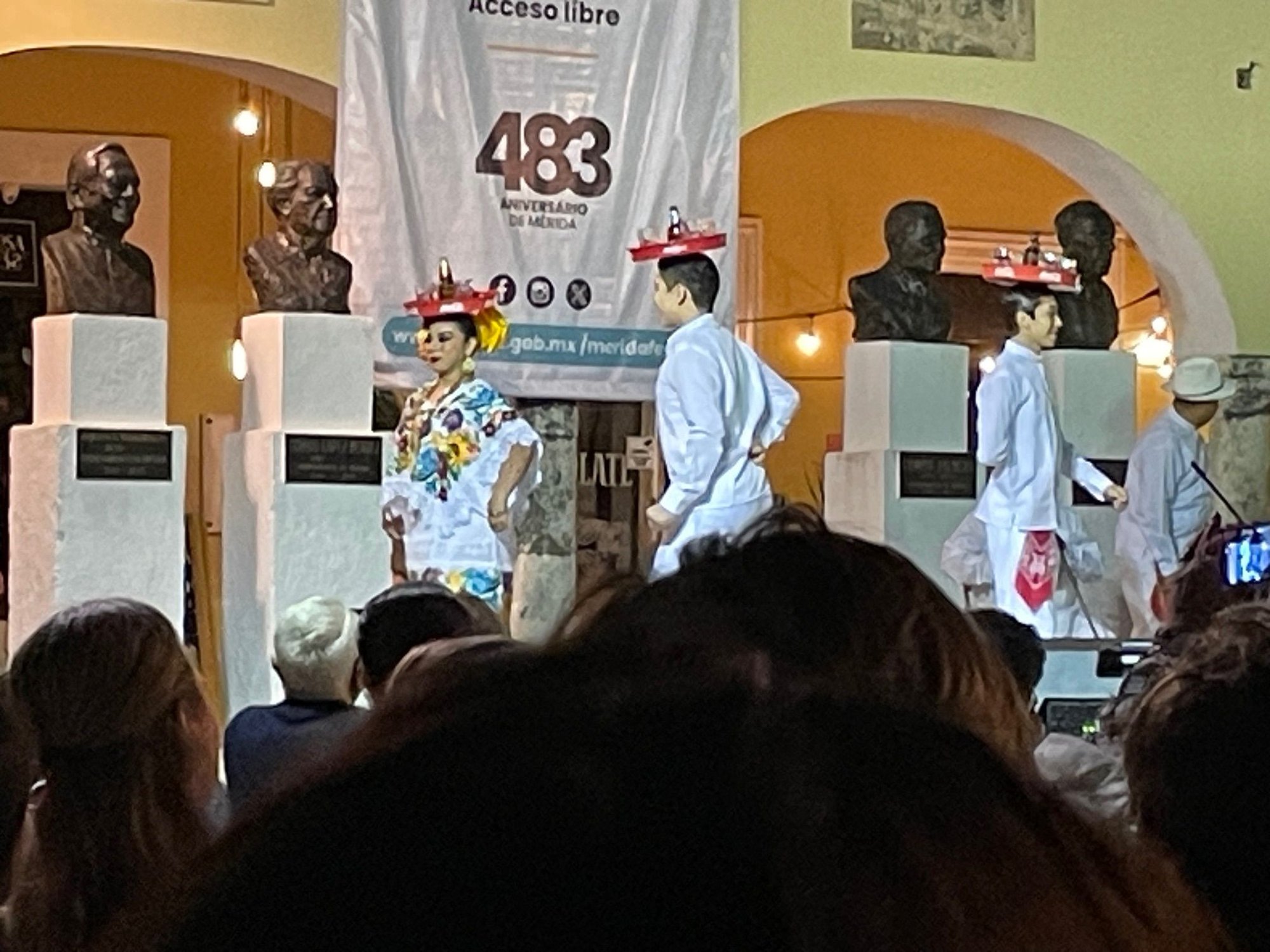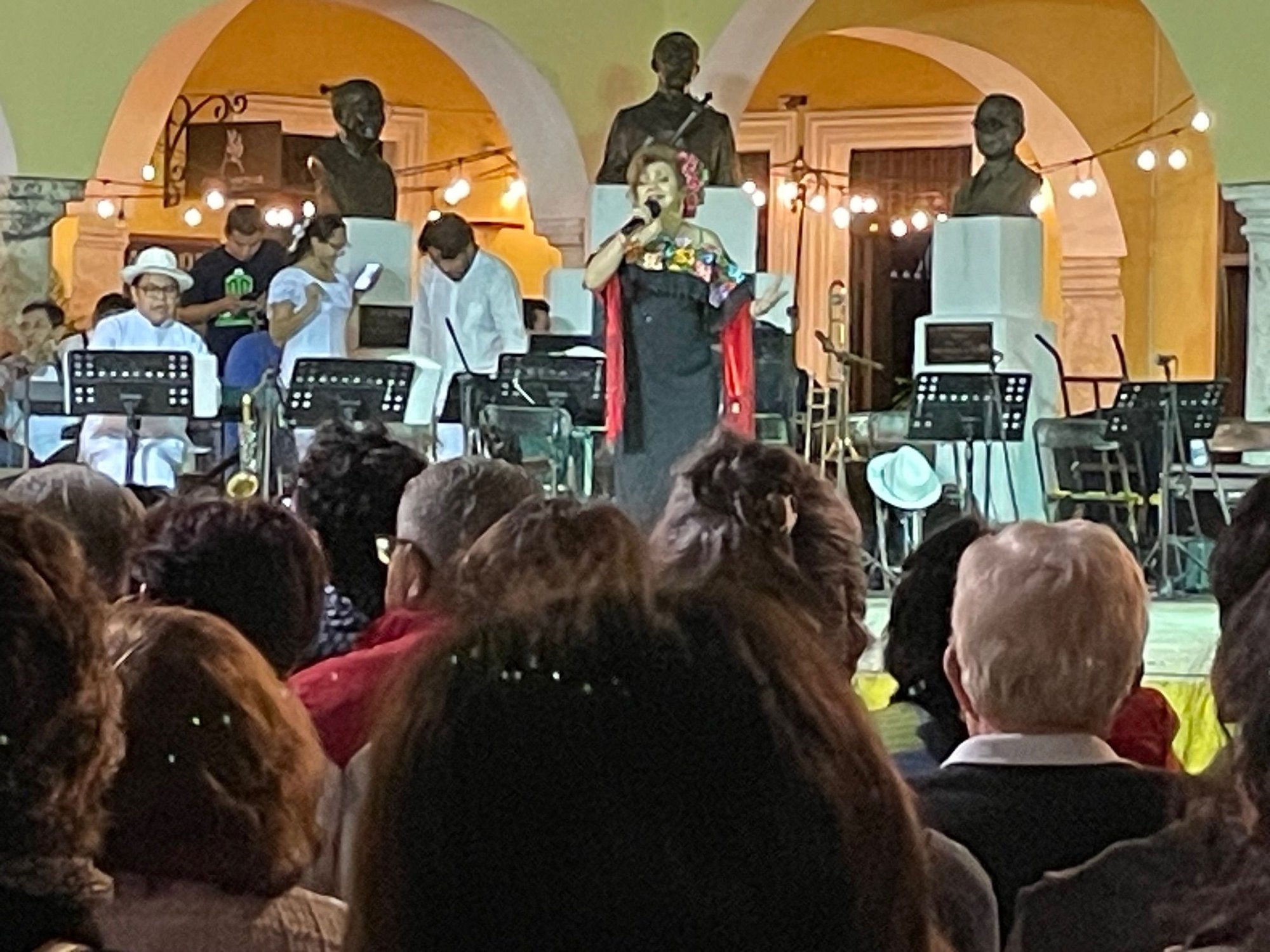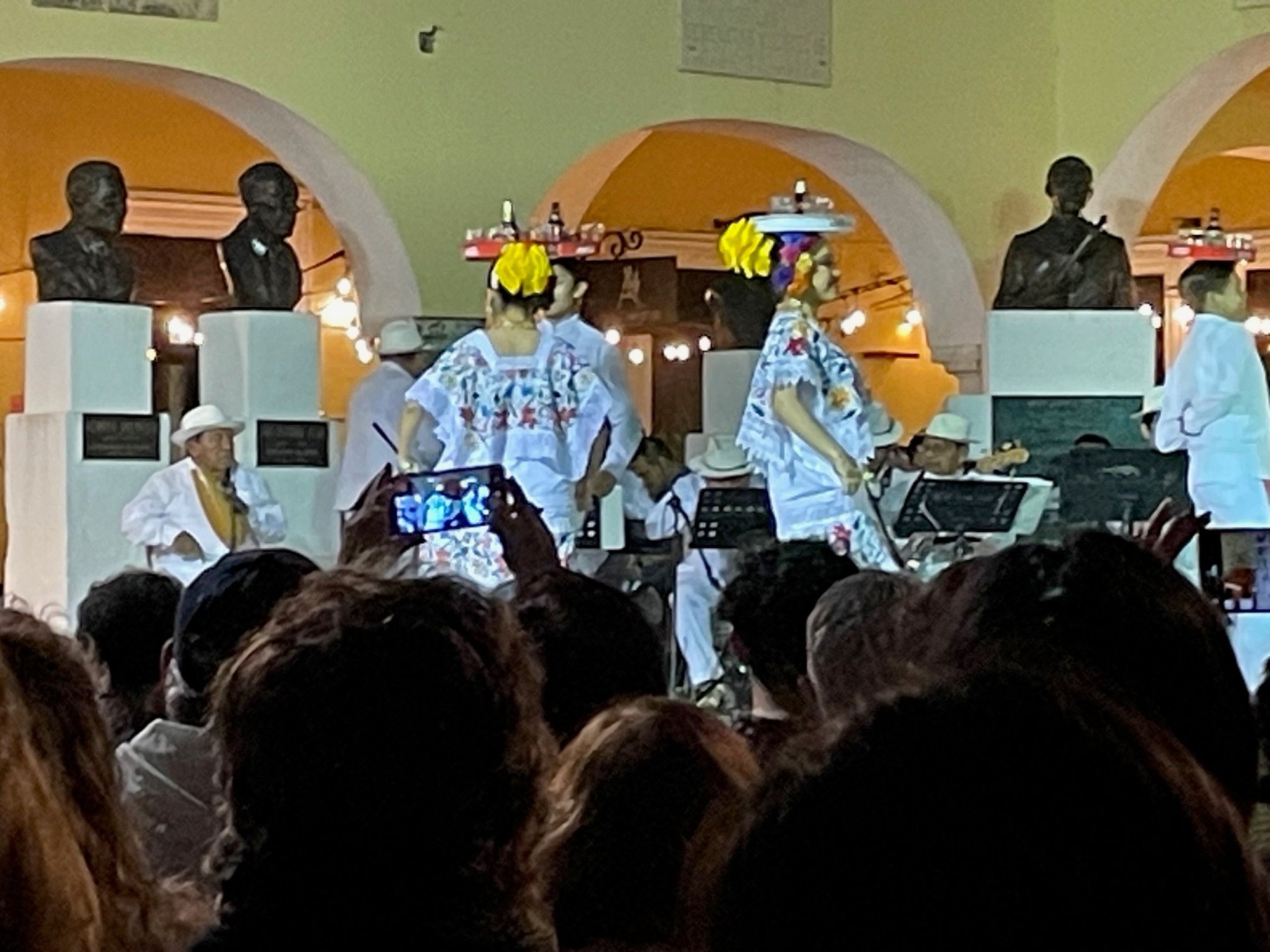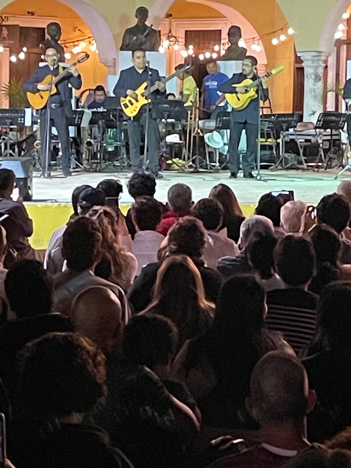 Unpacked, relaxed then off to Soriana for groceries, about a 8 minute walk. Went to La Chaya Maya for dinner and sampled, panuchos, papadzul, and various tacos, cochinita pipil being the best. Subtle tastes but very interesting, not the traditional on fire Mexican food. We will be here for the Merida Fest which lasts for one week starting yesterday but tonight was the kick off celebration in the Plaza Grande. String orchestra started with some traditional dancers and then 4 guys with guitars called Los Suglares came out and they were Fantastic. The had a guy playing guitar that Hendrix would have said, "How'd you do that". Watched the whole show and the weather is perfect, actually a bit cool which is not what we've read about Merida. So after our first day...I'm kind of leaning toward Chad and Mindy, this place is pretty cool.