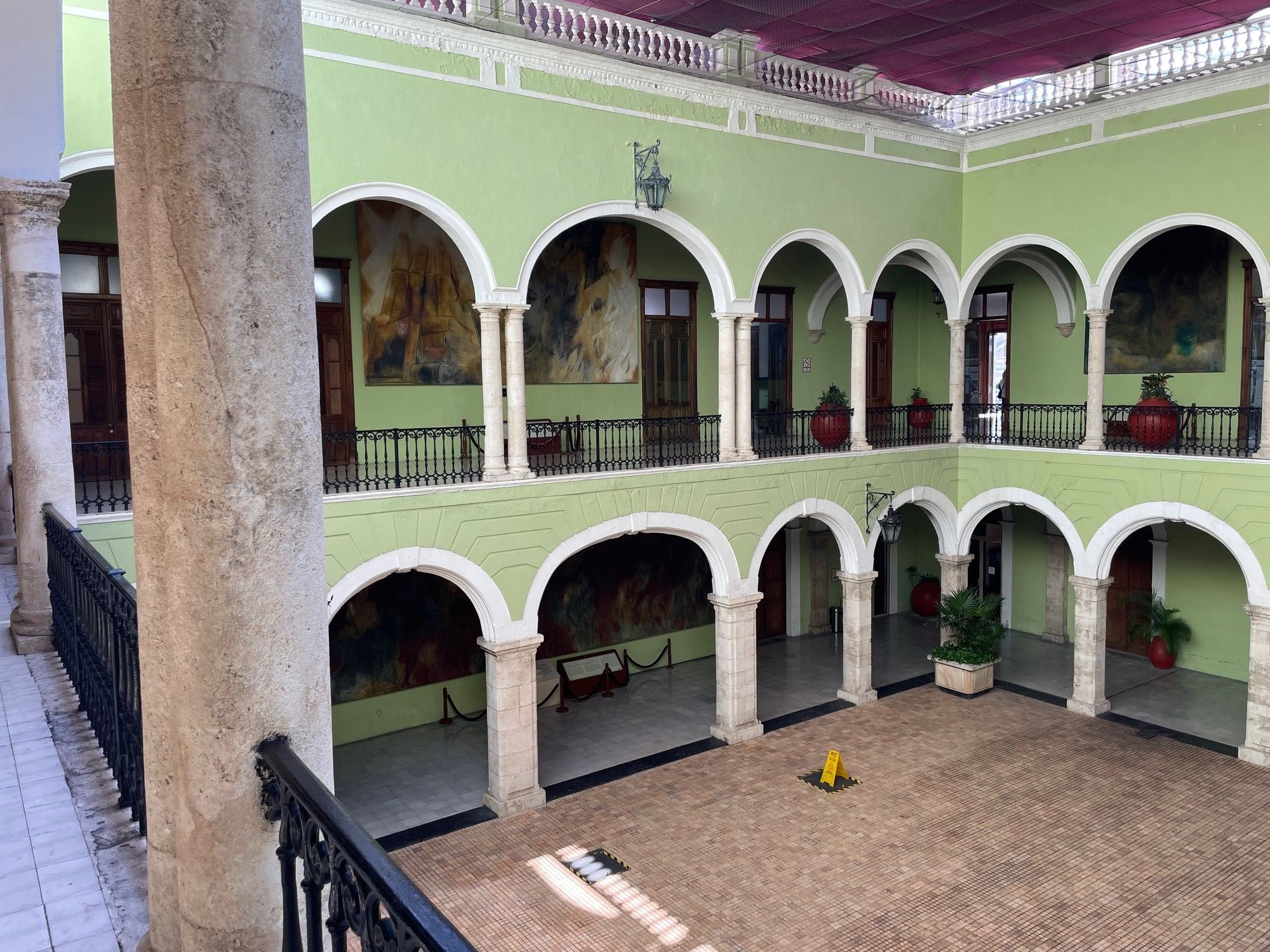 We are slowly wrapping up our stay here, we have three more days and today was a big one. We went to the Palacio de Gobierno, Casa de Montejo , a night walk on Paseo de Montejo and finally JAZZ at Dzalby Jazz Bar. Shout out to Crellston for the heads up on the jazz club. I've read a number of posts here on Fodors that say you don't need to spend a week in Merida and generally now that I am here, I would agree with that. But if you have the time, it is worth it stay a few days longer. That way you can hang around until 11AM like we did this morning. Also you can bake in a "bug" day as we did on Wednesday. Today was catching up on the things you "need" to see. First stop the Government Palace. This is where you will find the Govenor's offices. We had read about the murals by Fernando Castro Pacheco around the ground floor and upper balcony. We weren't prepared, however, for the hall of murals off the second floor which houses many more murals depicting the history of the area and the little museum on the first floor.
