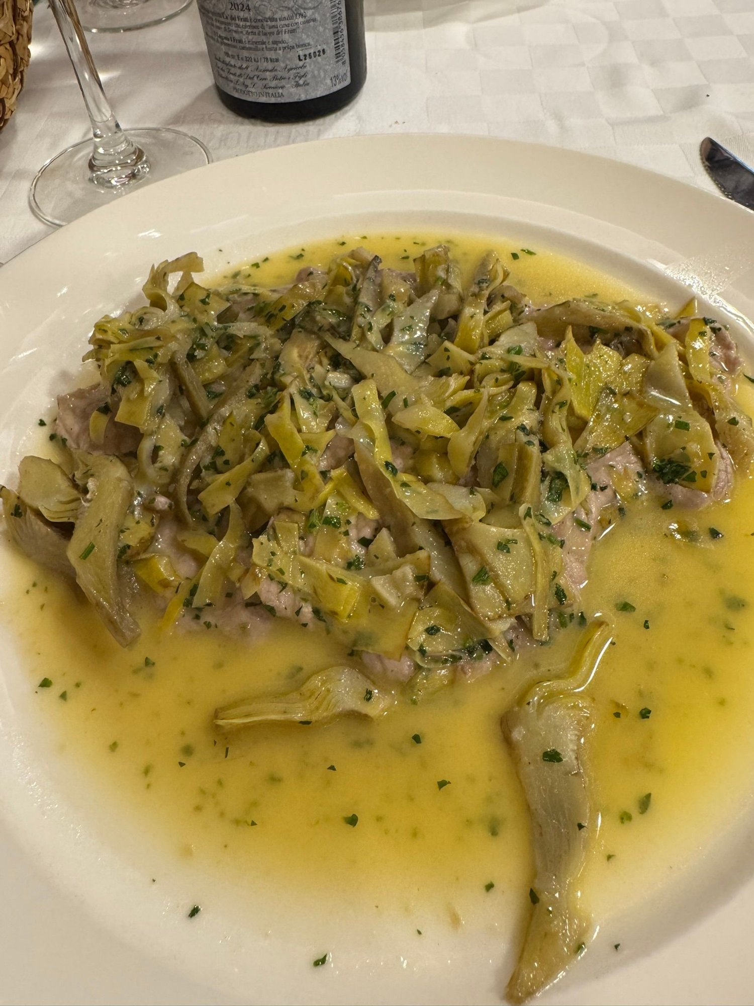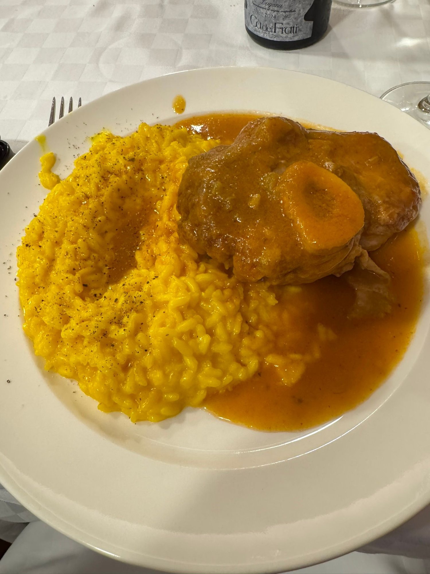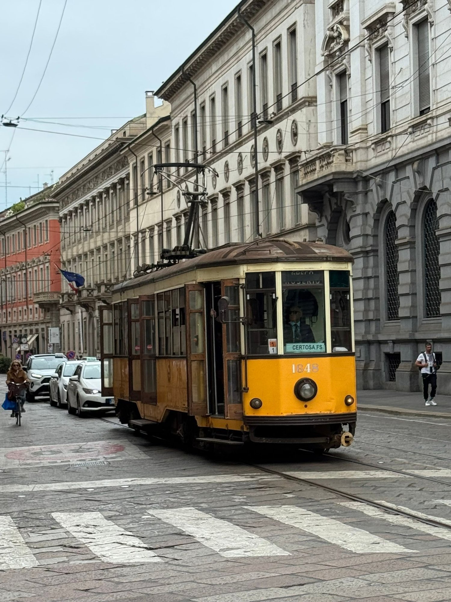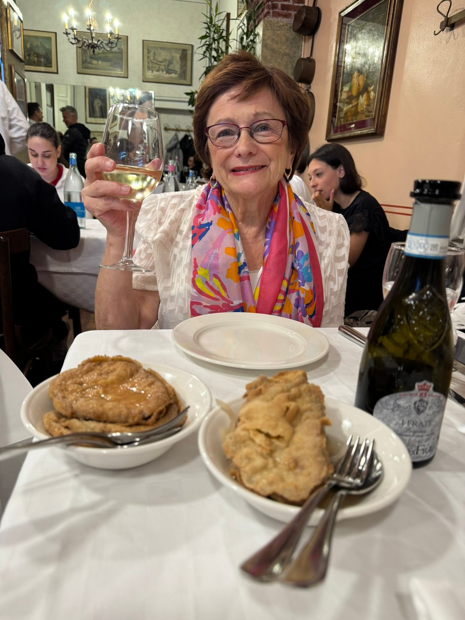 Dinner tonight is at Trattoria Milanese 1933, which we enjoyed very much. It’s about a 5-minute walk from our hotel. This restaurant serves traditional food, and so we tried some unique dishes. First up was an appetizer of cold veal and eggplant cutlets in vinegar and onions. For my main meal, I had veal scallopine with artichokes, and Ed had osso bucco with risotto. This was a great way to end our stay in Milan. Today was a perfect day until . . . .