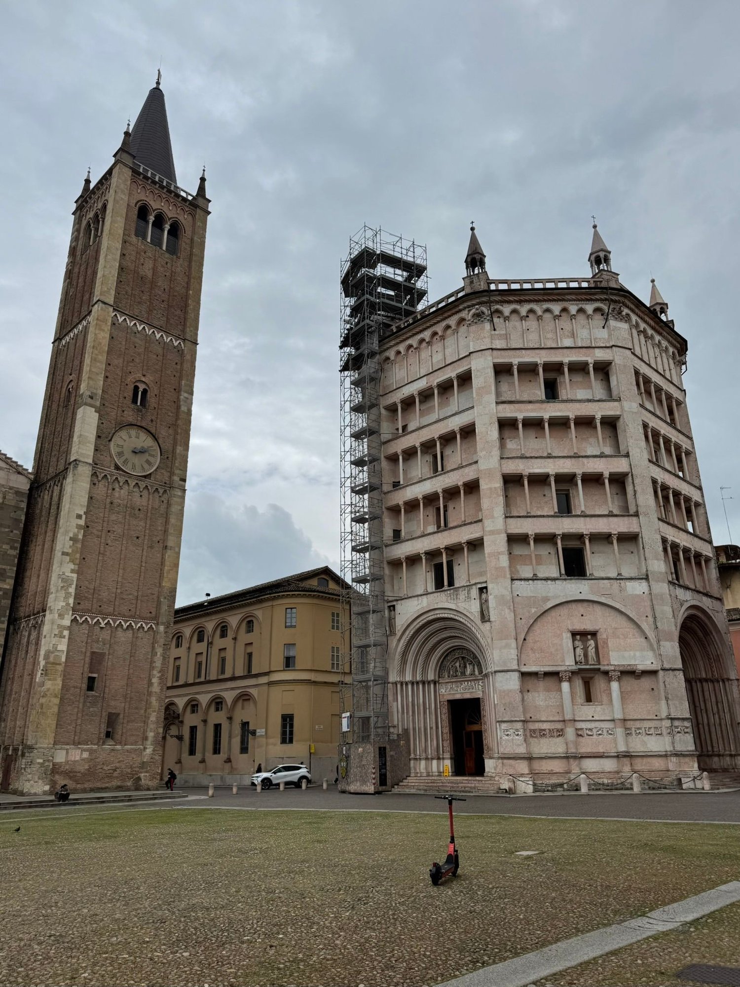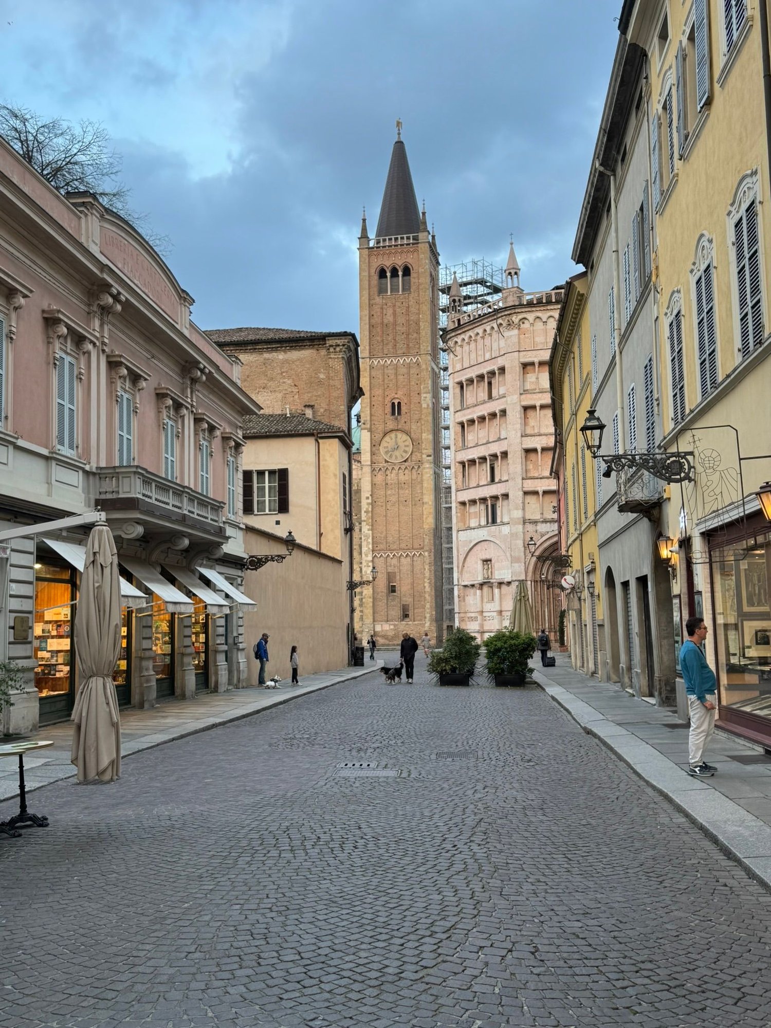 Parma in the early evening with the Battistero, Bell Tower, and Duomo at the end of the street.