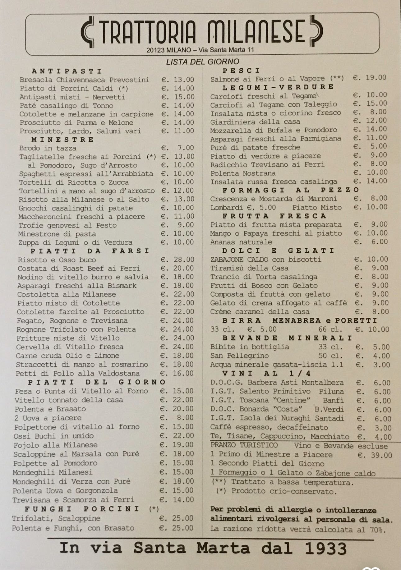 Menu from Trattoria Milanese 1933