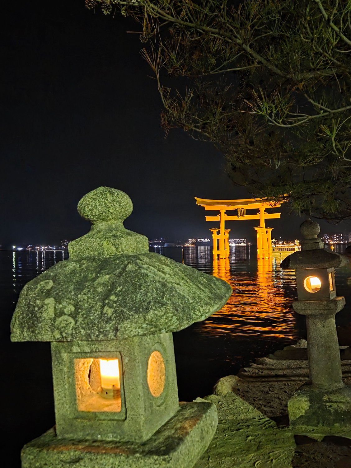 We returned to the station and took a local train to the Miyajima ferry. We had reserved a night at the Miyajima Seaside Hotel so that we could be there overnight and experience the island after the day trips all left. It was worth it! Our Japanese-style room was lovely and very comfortable, and dinner that night (in our yukata) was amazing. After dinner we went into town on the hotel shuttle for some picture-taking, and then returned for a soak in the bath at the hotel.