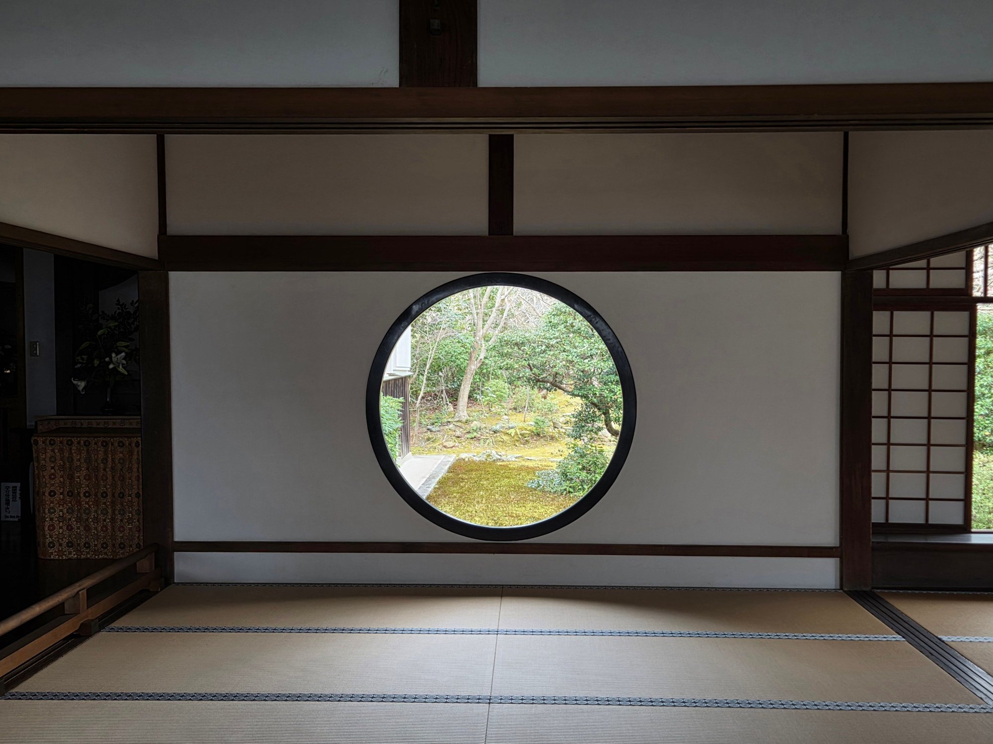 Genko-an Temple poses a riddle in wood. What is the difference between our ordinary way of looking at the world and the way of one who is enlightened? The answer is expressed in the form of two windows looking out over the temple's garden: one is square and is called "The Window of Confusion" while the other is round and is called "The Window of Enlightenment." Both look out over the same garden, yet the effect of looking through each window is quite different.
