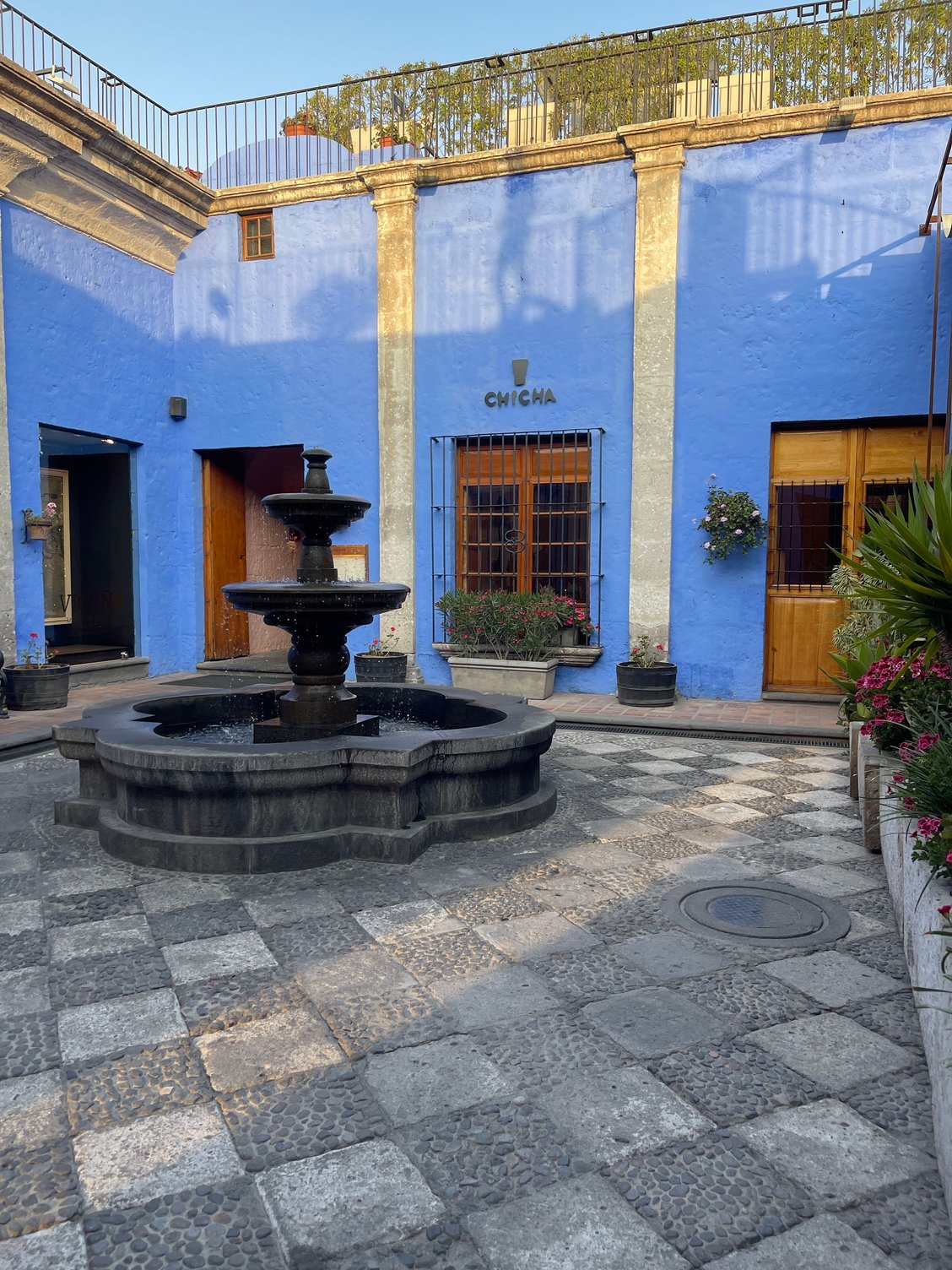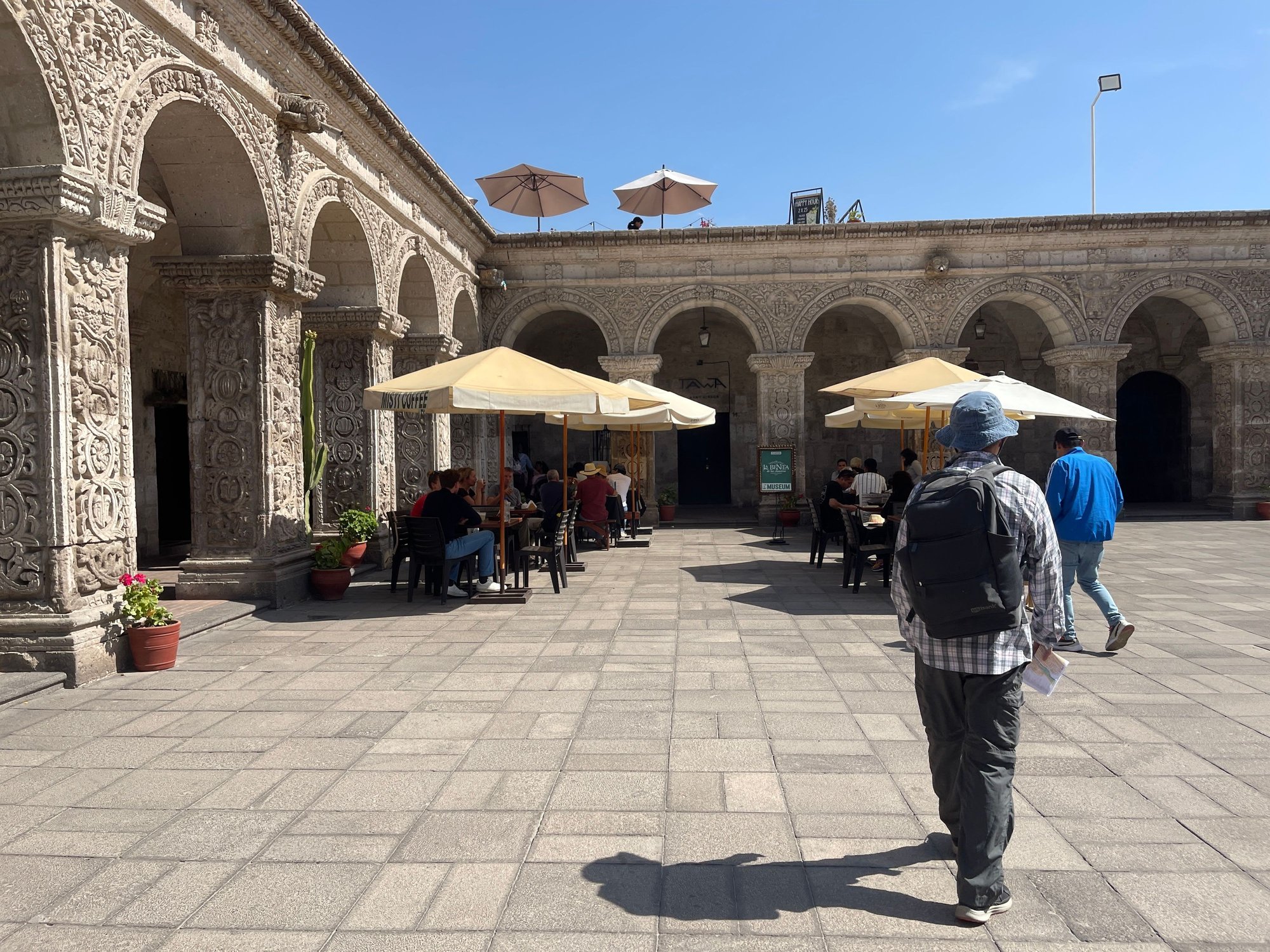 Arequipa is nicknamed “The White City”. It is 7661 feet above sea level, and serves as an ideal place for us to acclimatize altitude before traveling to higher destinations like Colca Canyon and Puno.Our flight arrived on time, and we had the hotel arrange a taxi to pick us up from the airport. We arrived at Hotel Los Tambos Boutique around noon. We were able to check in earlier and the front desk staff gave us a very good restaurant recommendation for our lunch— La Benita de los Claustros for Peruvian food. It is inside the beautiful Claustros de La Compañía.