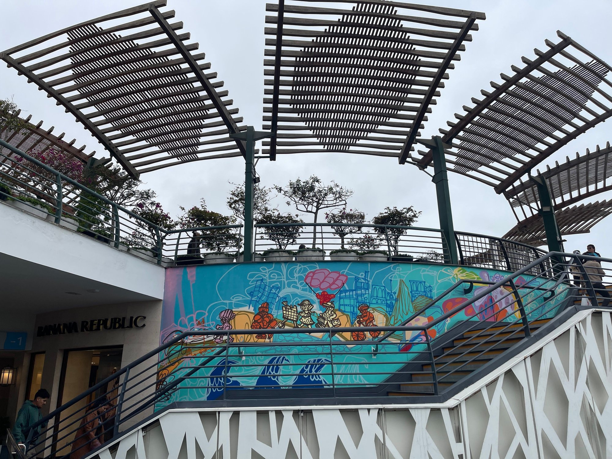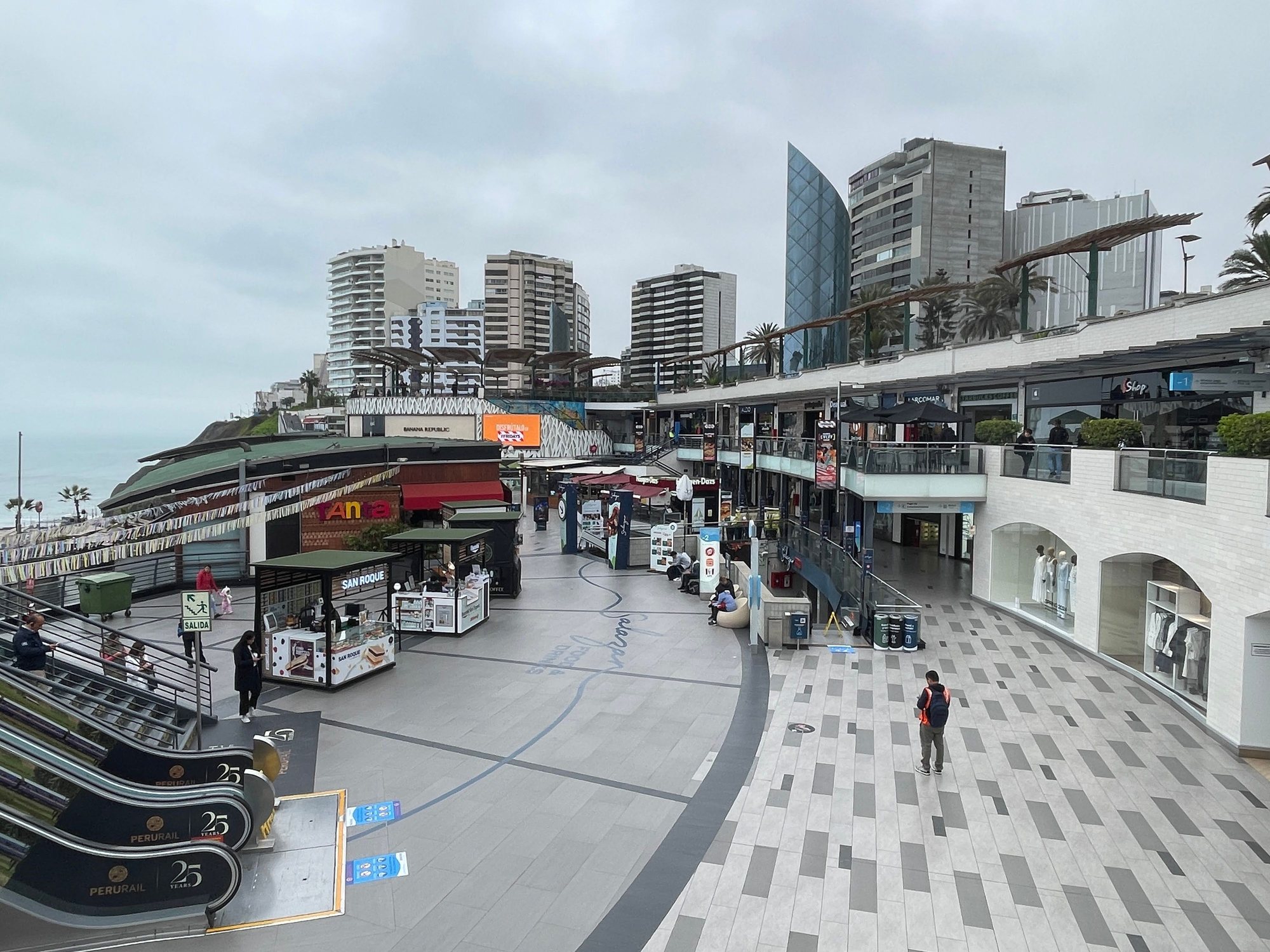 After our lunch and rested our legs, we walked along the beach front and promenade towards Larcomar. It was a good day and people were out and about walking along the beach front too. We checked out the jetty extended out to the sea with a restaurant, a number of sea surfers out in the ocean, and finally reached Puente Peatonal Makaha.
