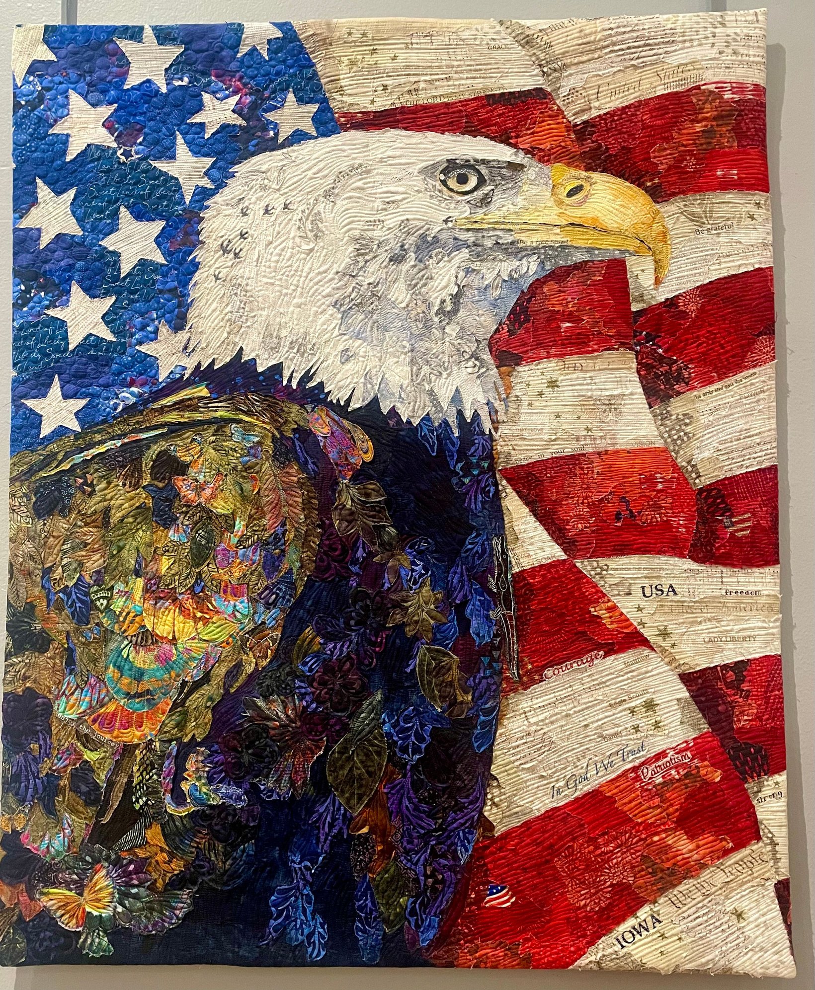 In Winterset we also toured the Iowa Quilt Museum, whose current exhibit theme was “Threads of Life: Portraits and Pets.” I won’t bore y’all with the many snaps I took of these gorgeous quilts, each one its own incredible work of art, but there was one in particular that recalled the imaginative portraits of the Italian Renaissance artist Arcimboldo that I want to share. I studied on this one and found a deer, a hedgehog, a sloth (I think), a rabbit, and so many butterflies (the artist’s favorite).