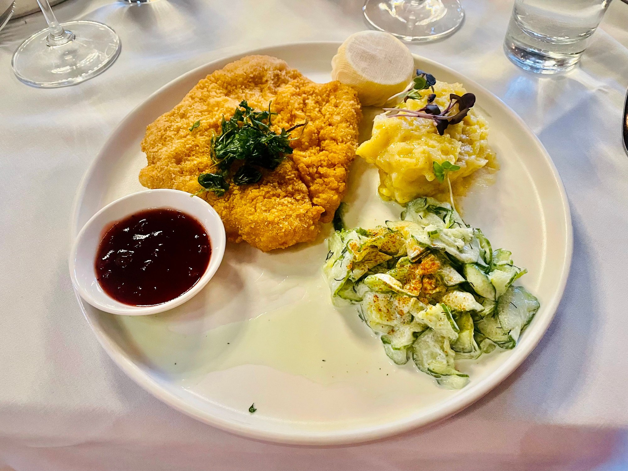 Wild Coincidences. There is a restaurant in Kansas City, Grünauer, that is owned by Austrian siblings…of the family restaurant, Gasthaus Grünauer in Vienna, Austria. AND, DH and I have eaten at the Vienna restaurant at least once! After our morning tour we sat for lunch. The Schnitzel was perhaps a tiny bit thick (but still delicious); and the potato salad and cucumbers were spot-on. The Grüner Veltliner was from the Wachau, an excellent choice; my Topfenstrudel made me smile, as did our Melange prepared with Meinl coffee. DH’s Aunt and Uncle had traveled to Vienna in years past and were excited to share this Austrian restaurant with us. Once again, a thoughtful recommendation from Uncle R.