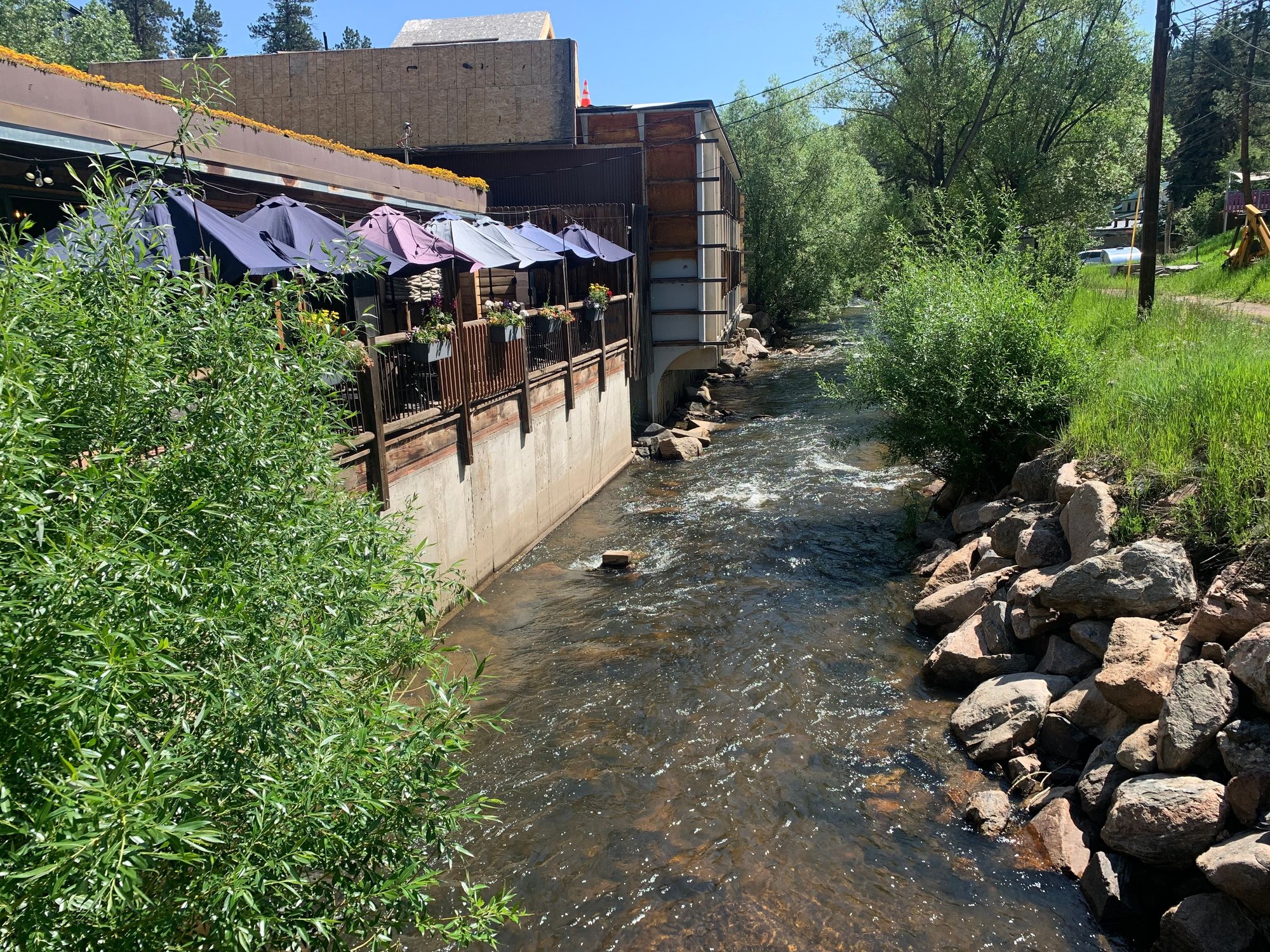 periodically cutting through the landscape. Evergreen had an old-timey Colorado feel with a wooden planked walkway separating commercial establishments, including a saloon. The guide suggested getting a coffee, beer or snack at an establishment here, but I instead just admired and walked beside the beauty of the creek that passed through town with rushing water.
