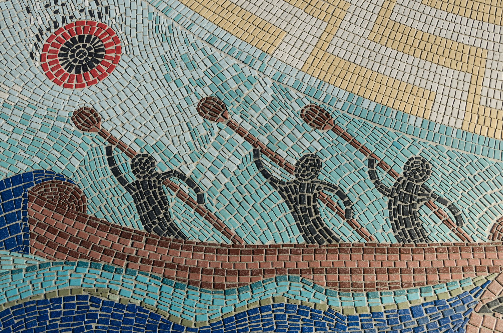 The Chumash hamlet of 'Syuxtun ('where the trail divides the village') once had 500 inhabitants. Today, visitors find a related 20' sidewalk-story circle down on Cabrillo, the main E-W drag by the beaches. Comprised of 210,000 tiles (we counted them all), the display was created by 230 associated church members.