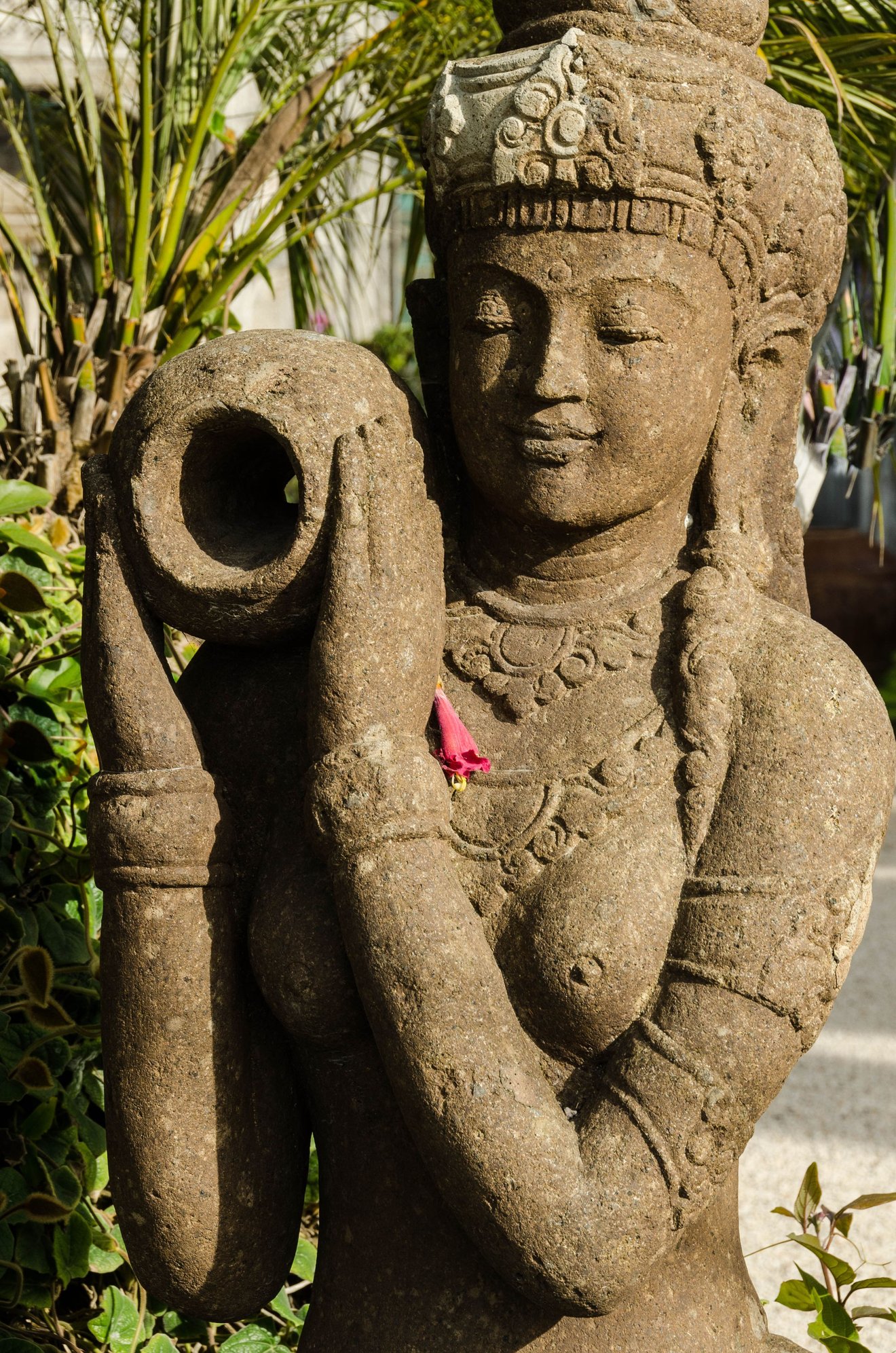 Beside that dogwood, this backlit beauty, with the sound of bees somewhere nearby. Someone had placed a lovely white flower in the lap of the Buddha statue. We also saw ferns near the lotuses and lily pond.