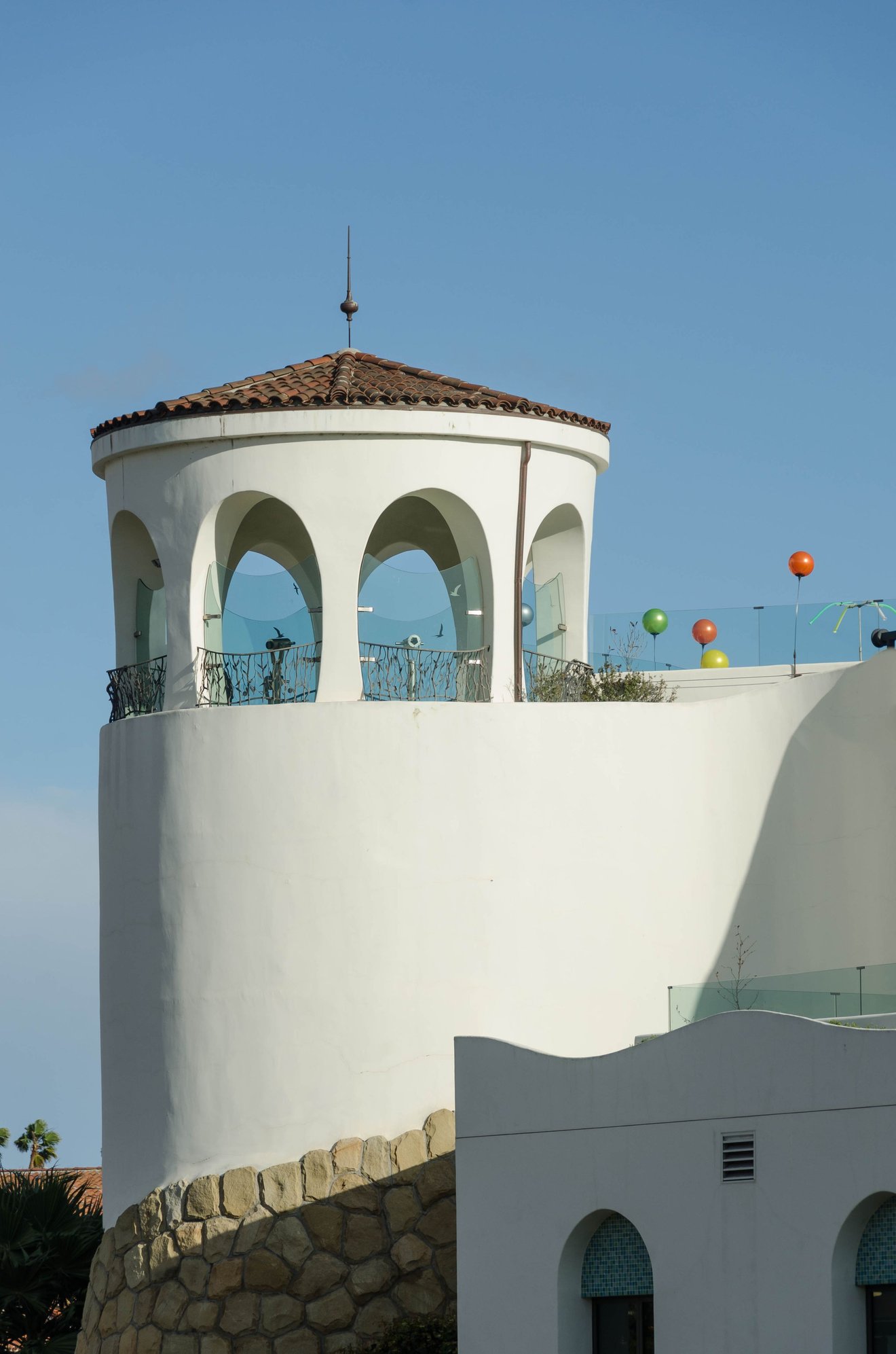 This is the Santa Barbara County Courthouse, built in 1929 and current site of countless weddings in its historic main mural room. Seen here is its 85' El Mirador clock tower. Many movie scenes have been shot on that tower's open deck, because expansive views extend in every direction. There are labelled plaques indicating what you are looking at: La Cumbre Peak (3990'), Montecito (3212'), 1st Methodist Church, Figueroa Gallery, former County Jail with sunken garden *Tower closes early at 4:00.
