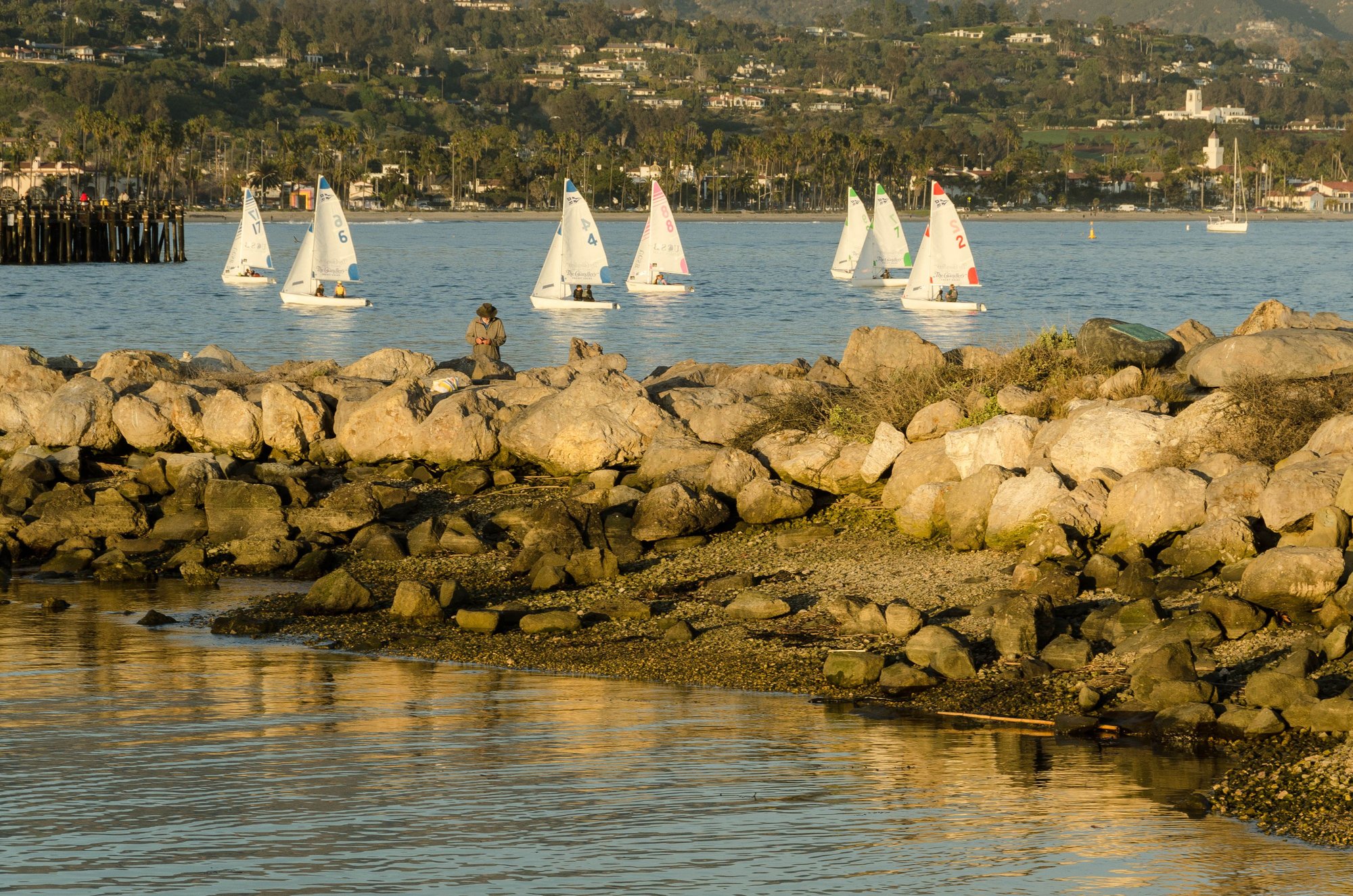 There was also a regatta. At that same location by the end of the pier, we had a nice chat with a former surfer, now a family man with kids in tow. He loudly encouraged a group of adolescent surfers, plus their surfing dads, as all they took advantage of local swells. He used language and abstract sounds that we'd never heard before. Do surfers have their own lingo?