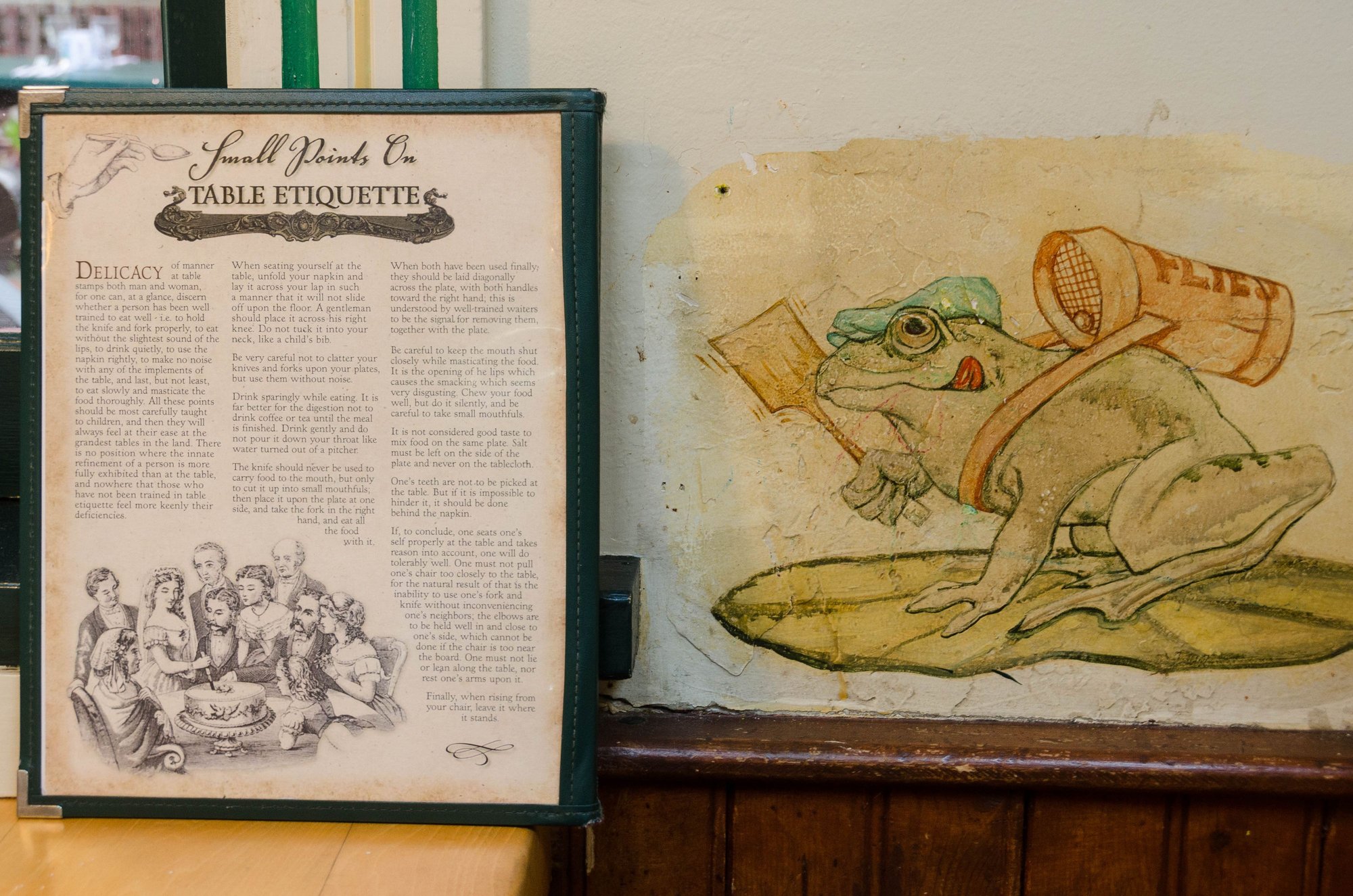 Breakfast in America. The Summerland Beach cafe is a fun, old-school family place. We went there early one morn, after seeing the sunrise. Shown here are its famed list of historic 'Etiquette Rules' beside its fly-hunting frog.