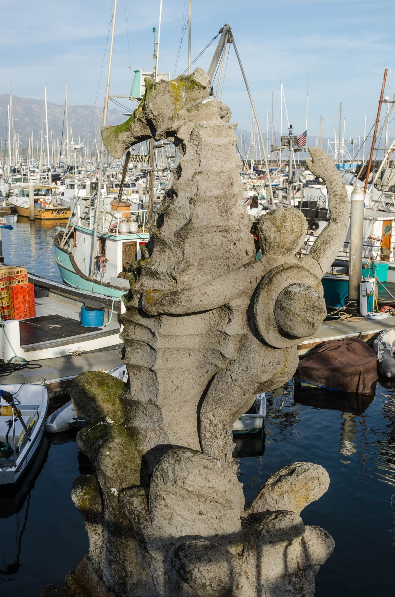 The Santa Barbara Maritime Museum is part of what I feel is an essential nexus during any visit: the marina. One may tour the museum and use the adjoined public washrooms, one may take-away coffee from Dart (yes yes yes), one can shop at either the permanent Fish Market or the aforementioned weekly one; there are water tours, restaurants, the old Purisima diving bell and West Beach itself. Not to mention the walk to the end of the pier and its surfers. *above: a historic masthead at the museum.