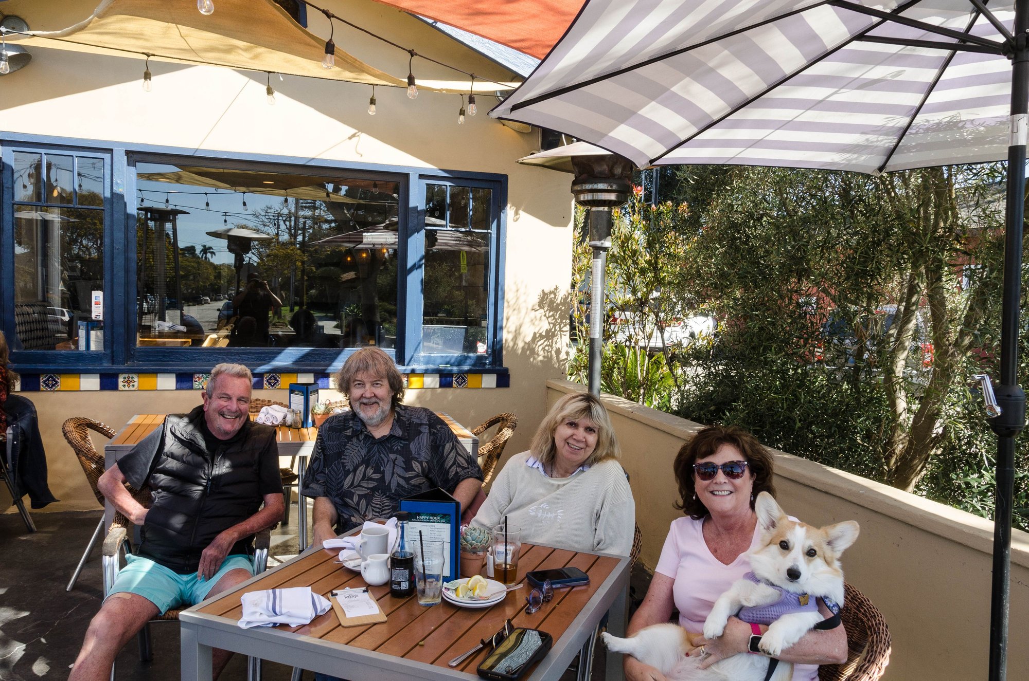 Mrs Z and I were in Carpinteria (Carp) hoping to renew our membership cards at the Mensa Society, when we chanced across a pair of local vagrants collapsed on the steps of Fieldings Cannabis Dispensary. They appeared to have dognapped someone's young Corgi. We felt sorry for them and took them all for a meal.