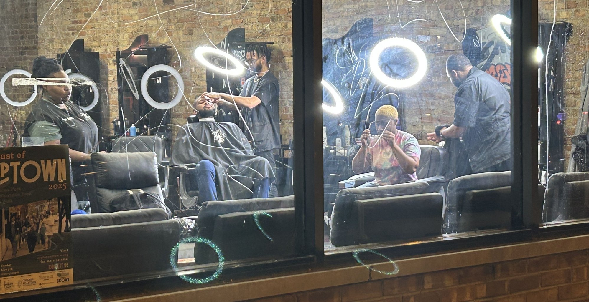 The neighborhood has some great features including a statue of a Color Wheel and a brightly-lit barber shop: