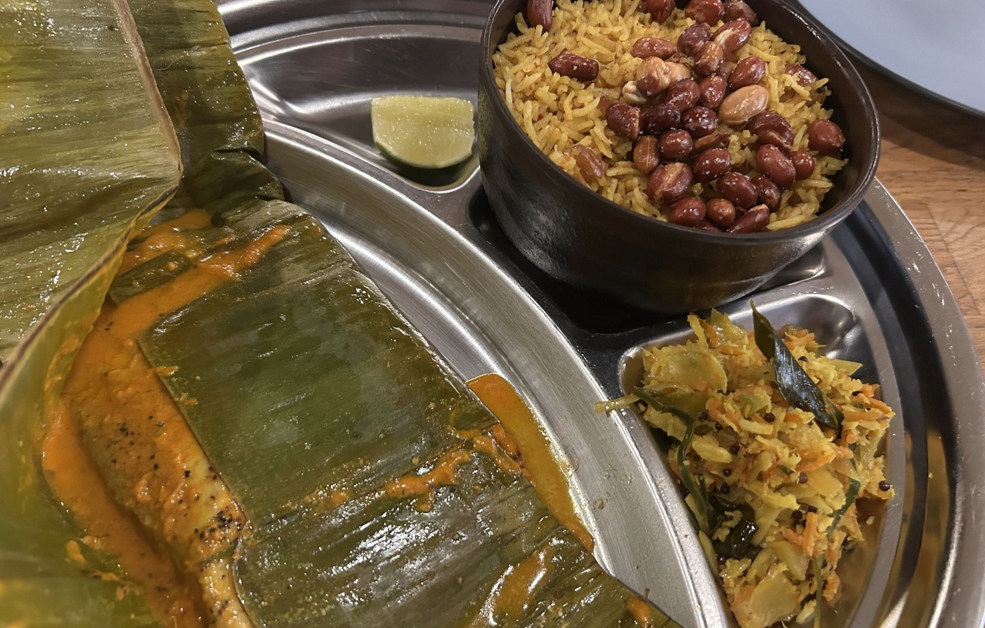 In my quest for exciting food experiences, I had my final dinner at Thattu, a Keralan restaurant. Kerala is a small state of India near the Southern tip. There are three Keralan restaurants in Chicago, and none just about anywhere else in the US. I had the pleasure of sharing my meal with a total stranger while sitting at the bar. We ordered as a unit in order to try more dishes. It's the only place I ate in Chicago where you need reservations for a table. The star here is the fish pollichathu, fish smothered in a spicy paste and wrapped in a banana leaf.