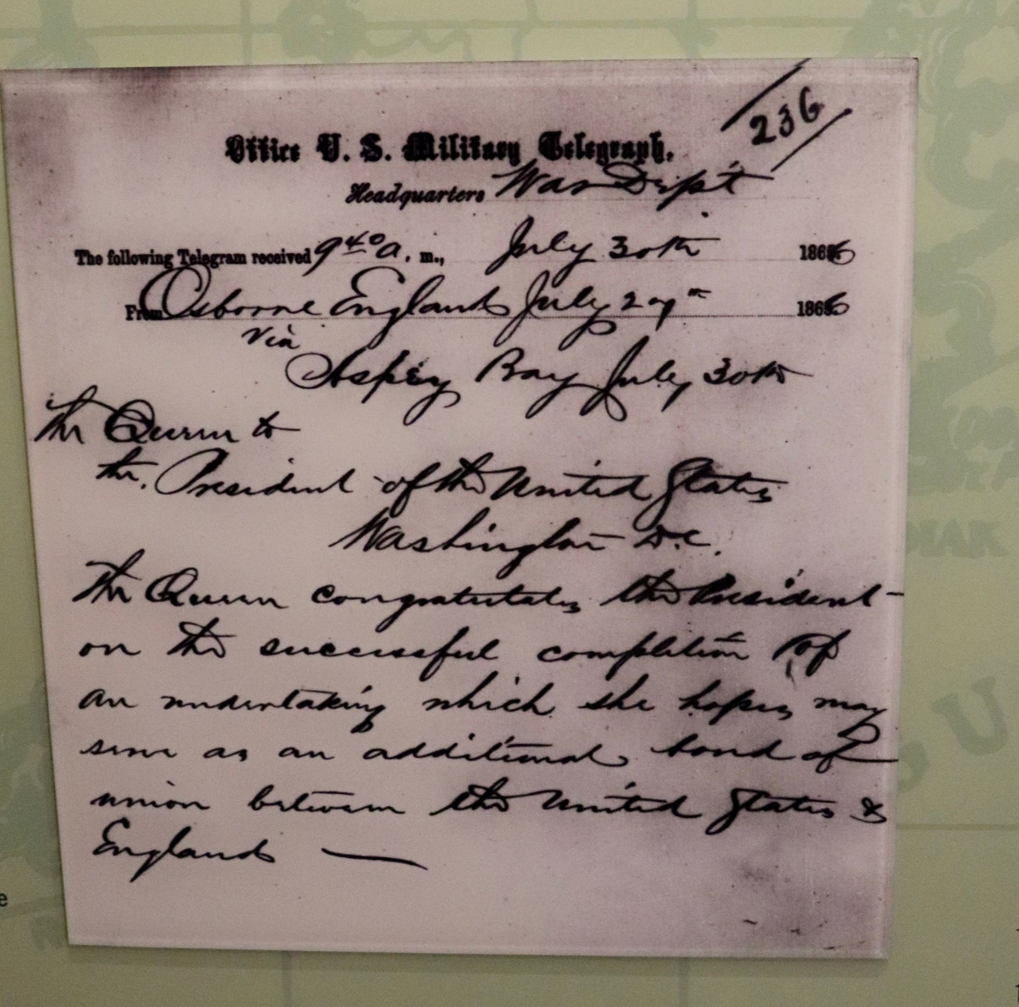 President Johnson and the Queen of England exchanged kind words of unity via the first Transatlantic Cable.