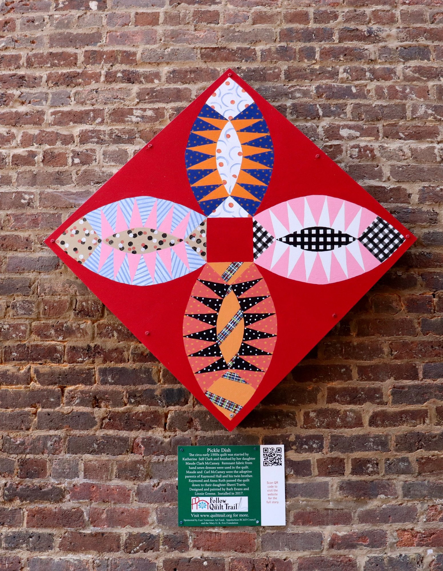 Greeneville, with all of its history, is also a town along Tennessee's Quilt Trail. I liken this trail to the unmarked Kunst am Bau that I would stumble upon serendipitously while out and about in Vienna. There is no map, there is no city-managed list from which I can plot my outings. I just have to stumble upon them, and stumble upon them we did in spades here.