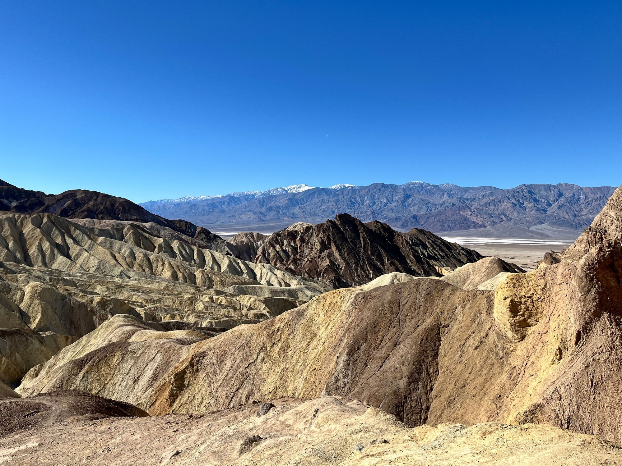 The rest of our afternoon was spent up and down Badwater Road: first was driving the Artists Palette Scenic Loop. This was around 3pm and we both felt a bit underwhelmed. Maybe the colors are more vibrant at a different time of day? This is followed by driving the unpaved road out to Devil's Golf course to see all the jagged salt formations. Finally we drove all the way down to Badwater Basin for sunset. At -282 feet, this is the lowest point in the US. The ground is all white; us being from New England, it looks just like snow, but in fact, it is all salt as far as the eyes can see. We walked way out into the salt flats, maybe 3/4 mile out. The farther you head out, the clearer you can see the polygon formations of the salt flat.