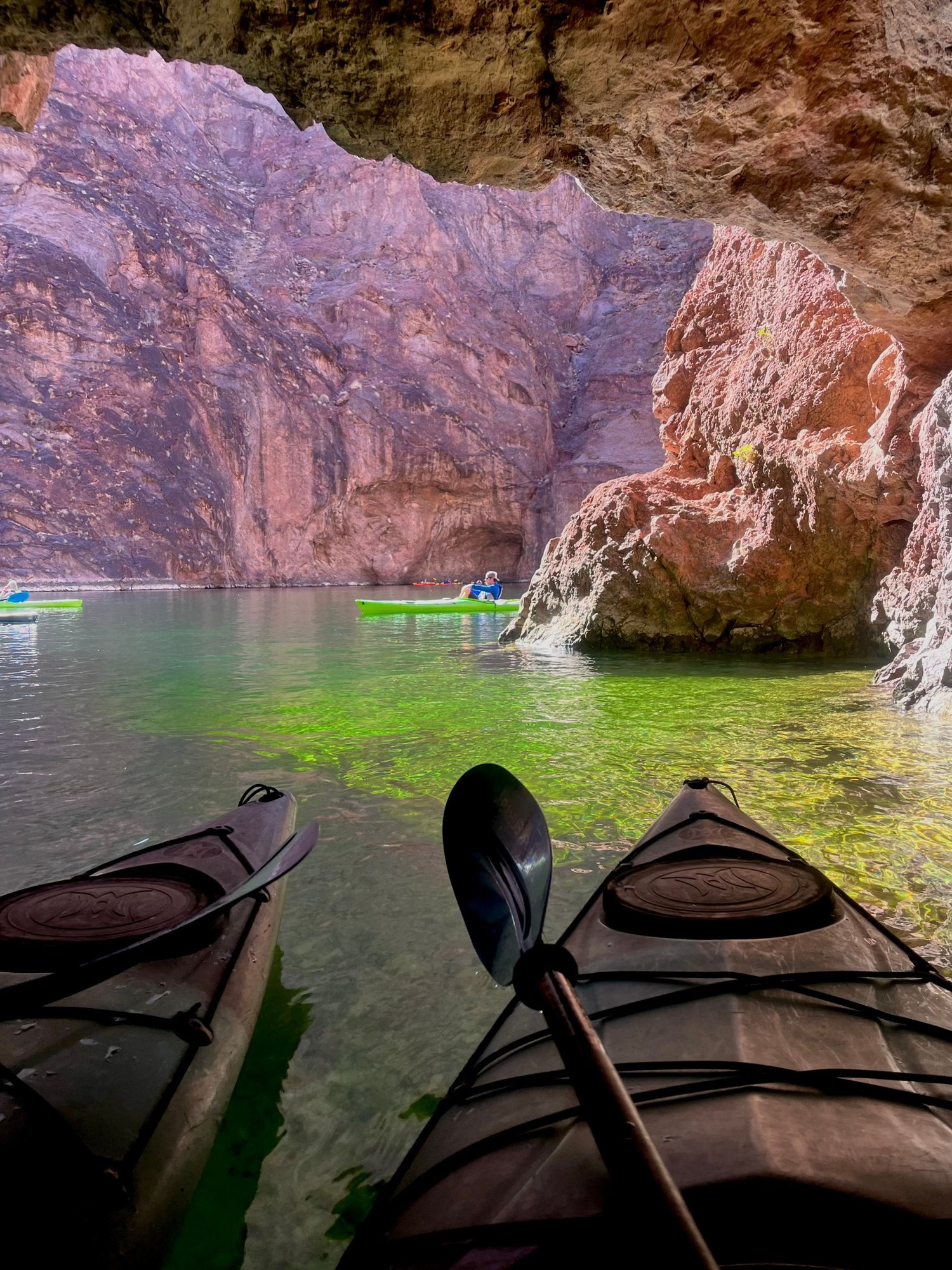 This stretch of the Colorado River is in between 2 dams (Hoover and Davis), so the water is very calm. Water temp is constant year round at 55F. The kayaking is very easy. We had to wait a bit to get into emerald cave for the group photo. According to our guide, it gets super busy in the summer and it's a much longer wait.
