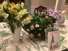 Yellow alstroemerias, pink vinca and lavender stock in a hodgepodge of containers and sizes.  Our Easter meal is breakfast this year.