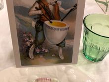 The rectangular dish is one of a set of reverse decoupage on glass. I use them on the table as bread plates.