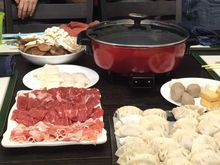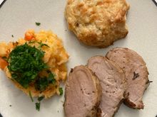 Roasted lamb, sweet potatoes and carrots, Brussels sprouts, and cheddar biscuits