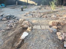 First pic is some of the stonework being done and one of several footbridges over areas that will act as little arroyos , and the vessel that will be a birdbath/ fountain that will run off a solar pump, sun being in unlimited supply here.