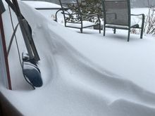 Hard to tell how much snow has fallen so far because the wind blows it off the surfaces but you can see it drifting against the house.