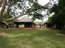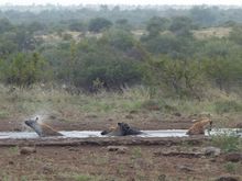 Early morning, a pride of 5 lions were sleeping under a tree across the river (3 shown)