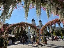 The very pretty main pedestrianized street line with arches of flowers.