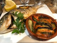 My lunch at Brasserie Le Verdun - whole fish with grilled vegetables.