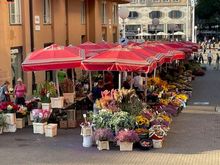 Woman guarding the Dolac, next to woman leaving the Dolac