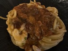 Spaghetti alle carrettiera, with pistachio pesto, cherry tomatoes, capers, and topped with the long strips of baked ricotta that you see on the top of the pasta....very good but not repeatable.