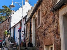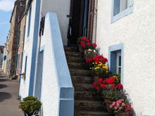 Waiting at scenic bus non-shelter, Anstruther. We peer around the corner, hoping to see it come.