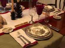 Deer centerpiece instead of flowers., above. Below, pewter chargers, flatware and wine glasses with pewter stems are used in this setting. We have pewter goblets also but they make the table look too masculine IMO.