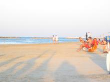 Some families folk dancing on the wide, spacious, public beach in Senigallia, late afternoon in July.