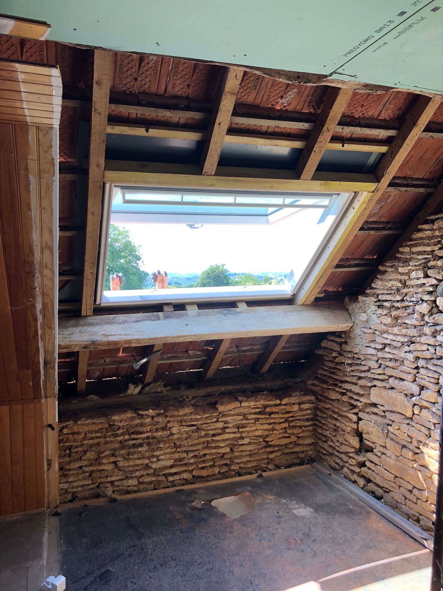 Here’s another shot for context. This is going to be the bathroom, with the tub just below the window. This is under the roof, which is on the US second floor (French 1st floor). The stone walls are exposed downstairs which we love.