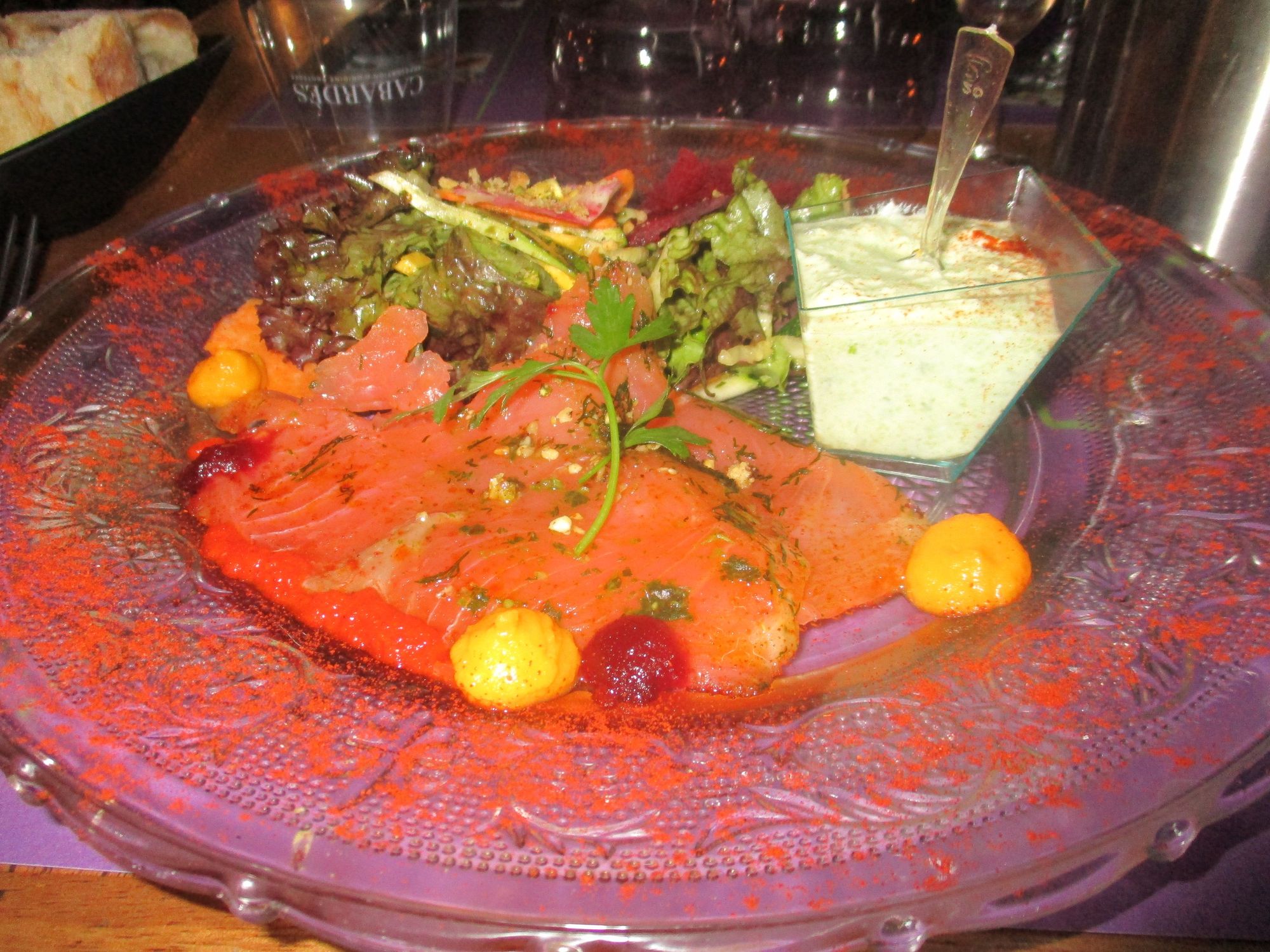 And it was: Gravlax with crunchy vegetable salad and several compotes and tzatsiki
