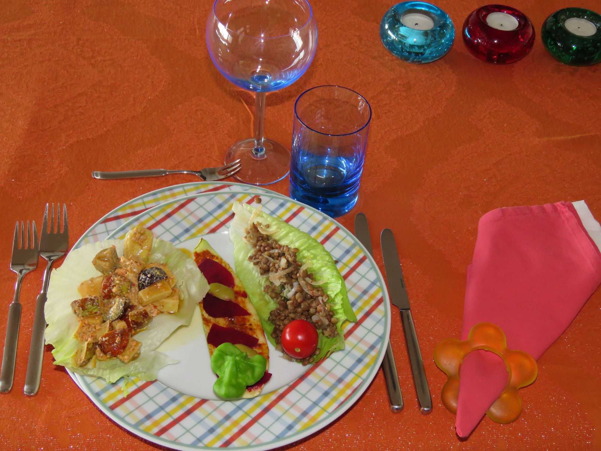 jujube salad on the left, zuccini in the middle and round green lentil salad at right