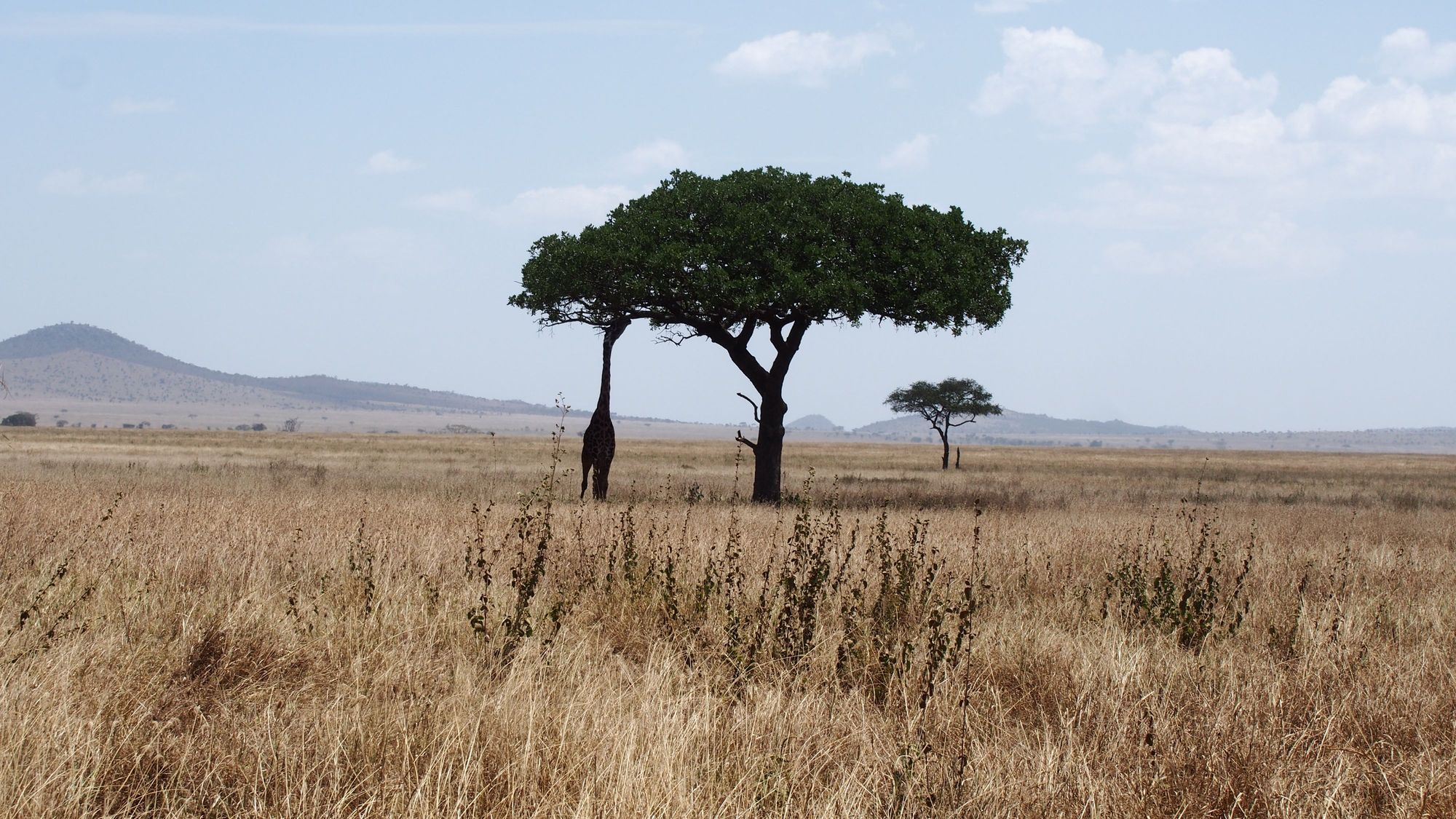 Giraffe grazing on the iconic Acacia tree of the Serengeti
