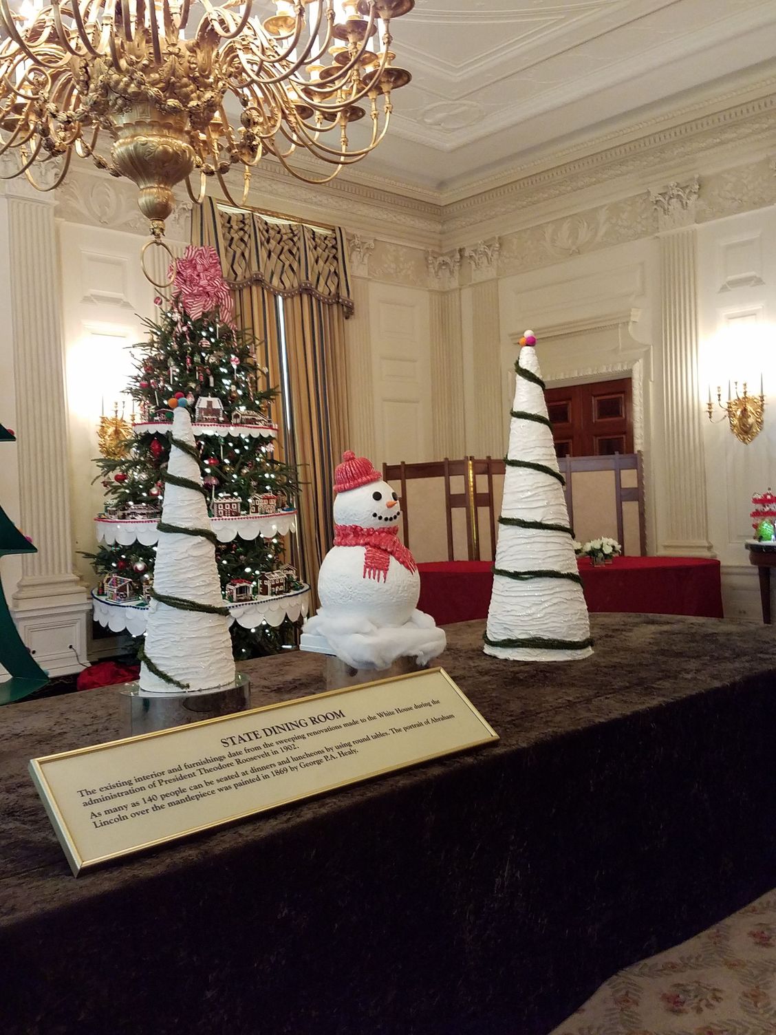 One of the "Lego trees" - to the left of the white gingerbread White House. I don't know which one is the "ugly" brown WH