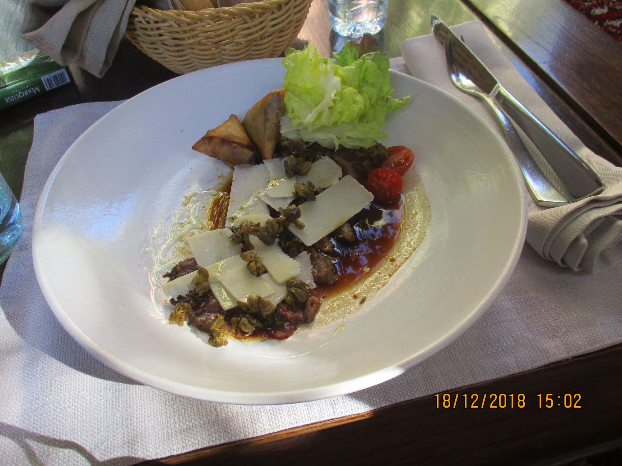 Lunch at Dar Rhizlane - weeping beef with parmesan shaves and minced lamb samosas