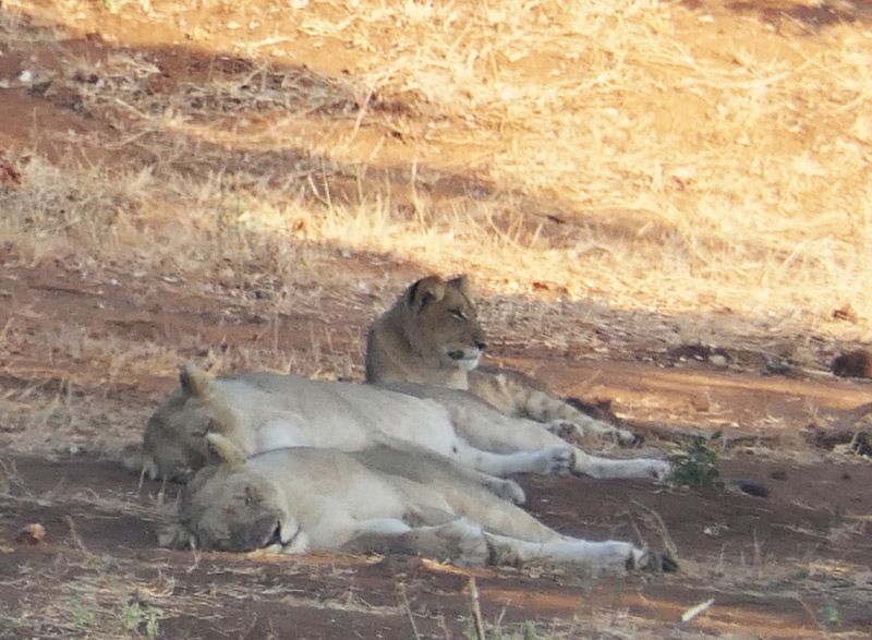 Early morning, a pride of 5 lions were sleeping under a tree across the river (3 shown)