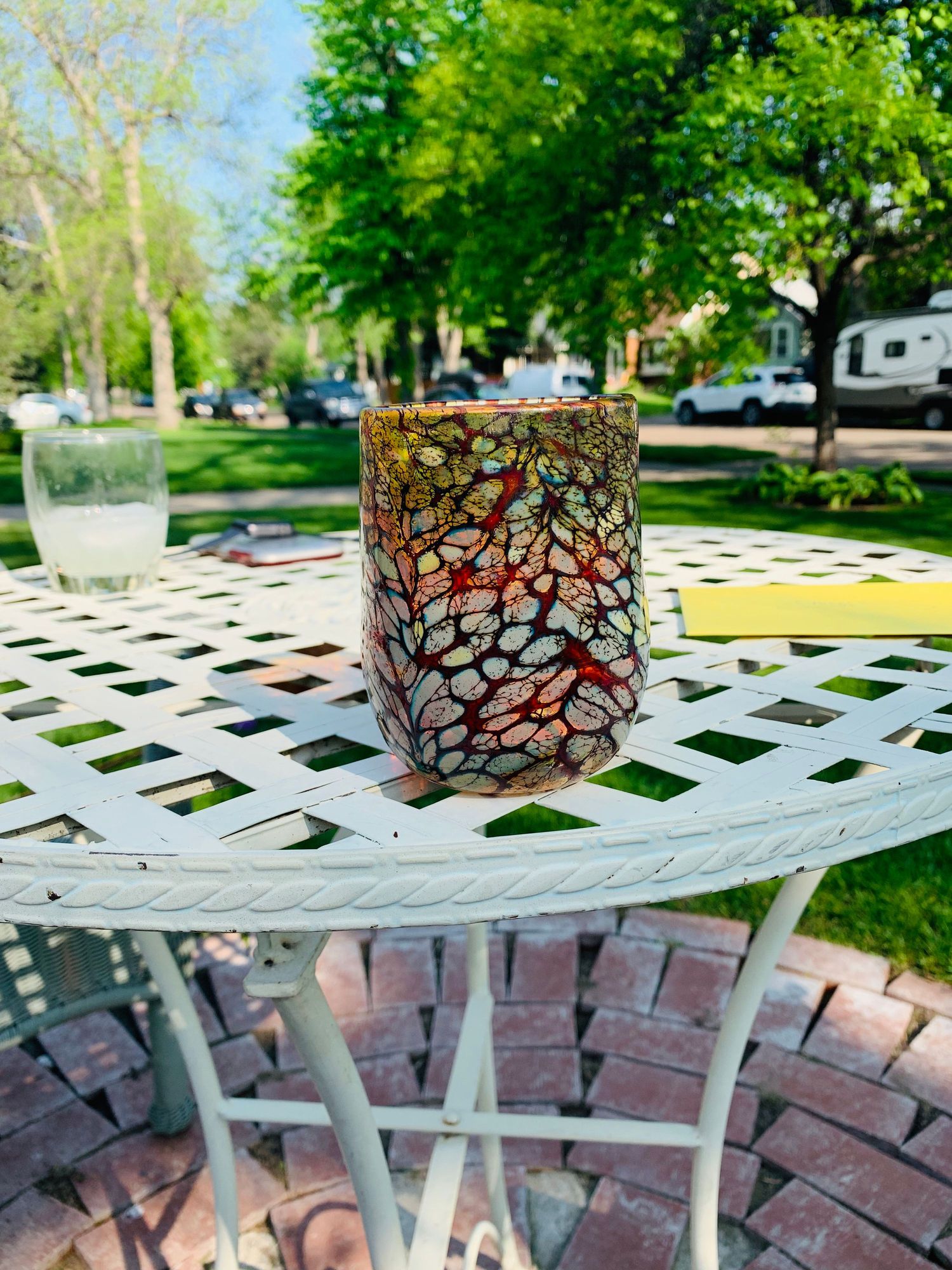 Glass made by a friend. Graduation card on the table for across the street neighbor.
