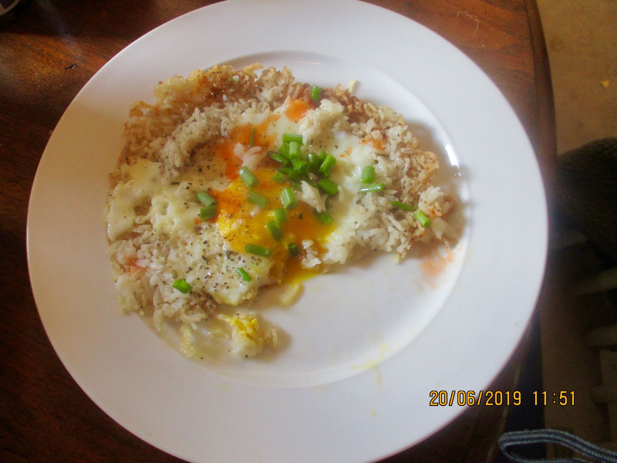 A favorite breakfast: crispy rice, soft egg, and scallions