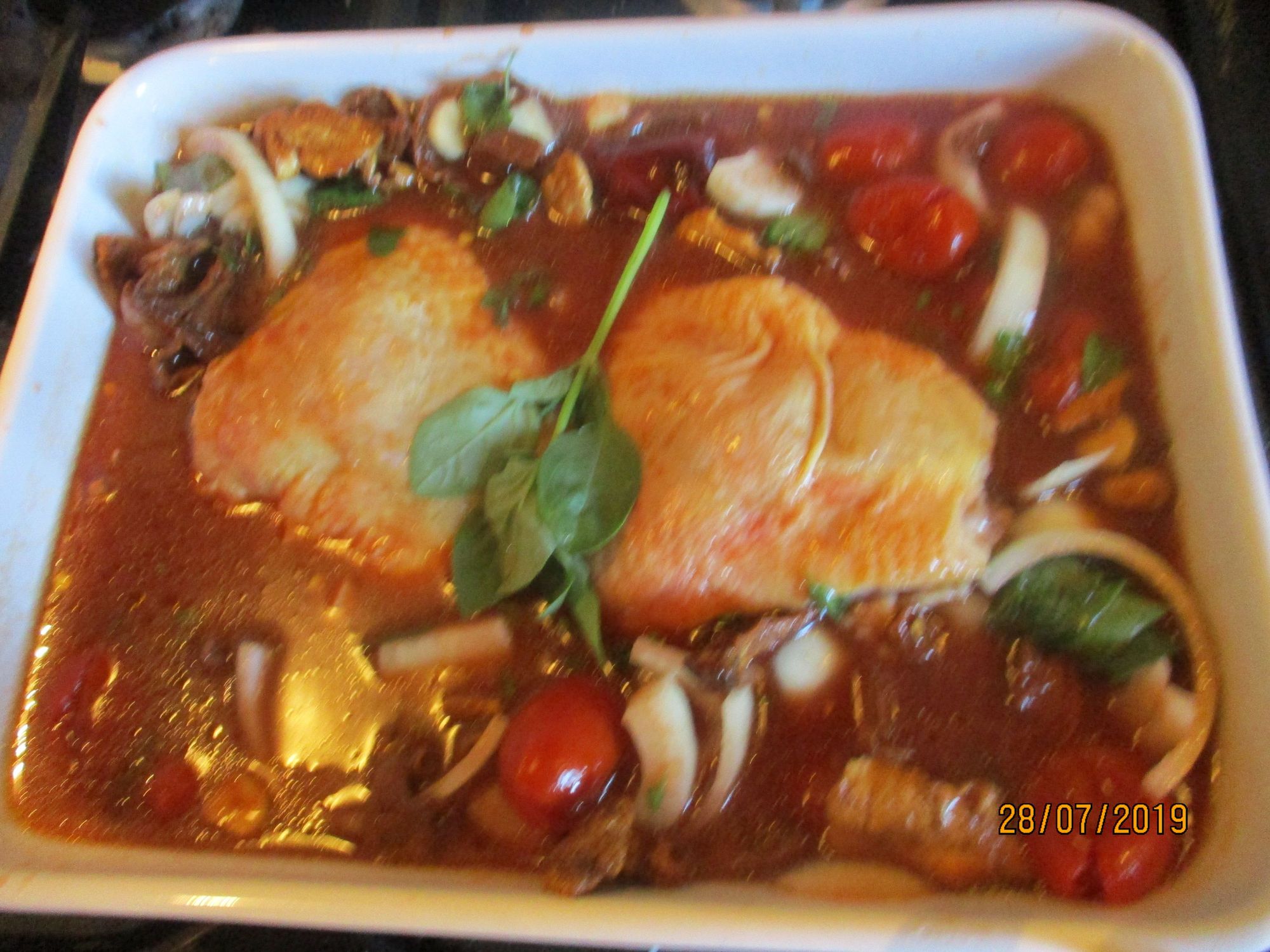 Roast chicken thighs in fresh garden vegetables and wine and herbs, and well, whatever...